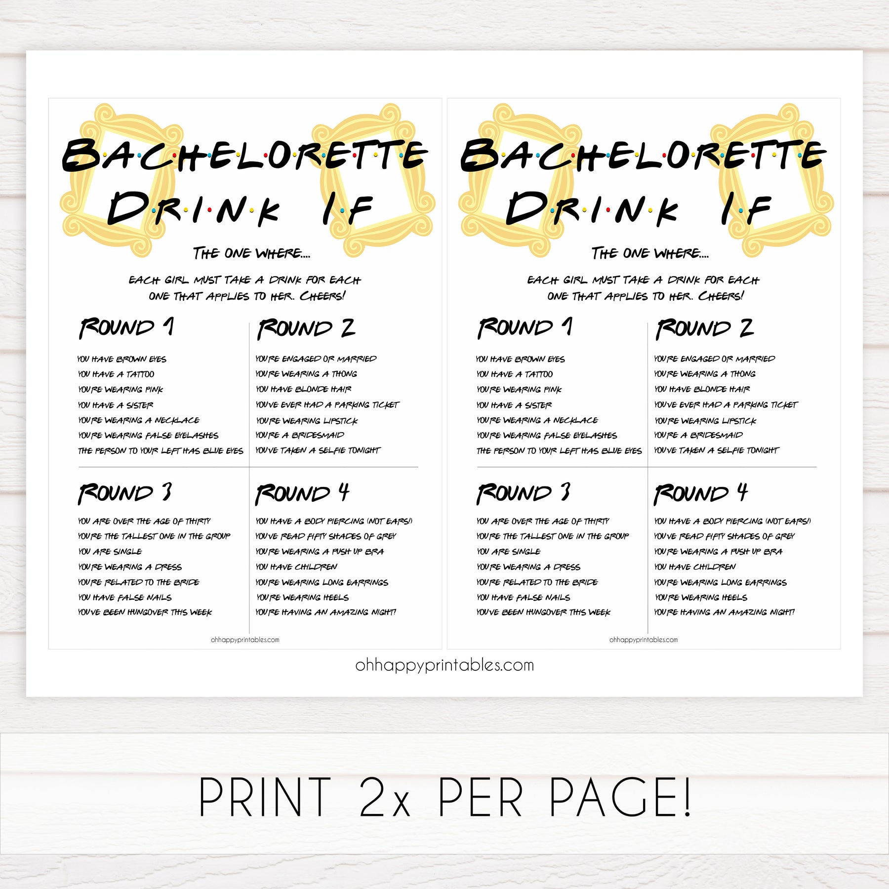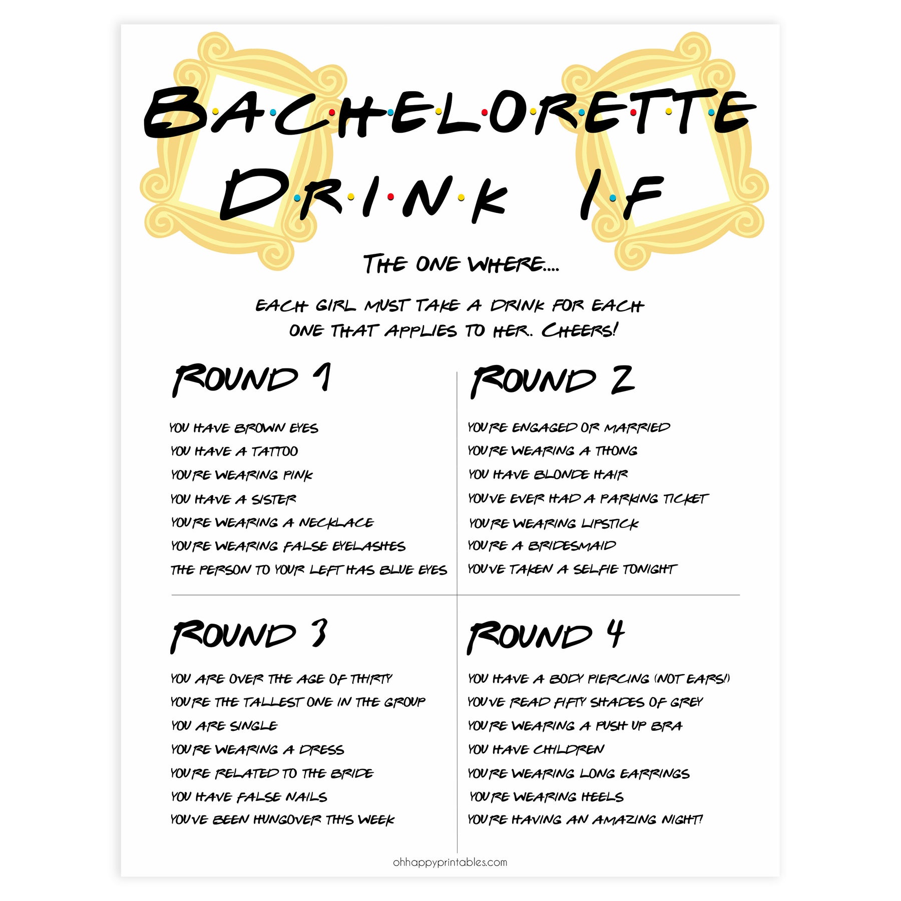 Get everyone in the mood to party with this hilarious Bachelorette Drink If game! Featuring a variety of fun scenarios, no one is getting away without drinking here!