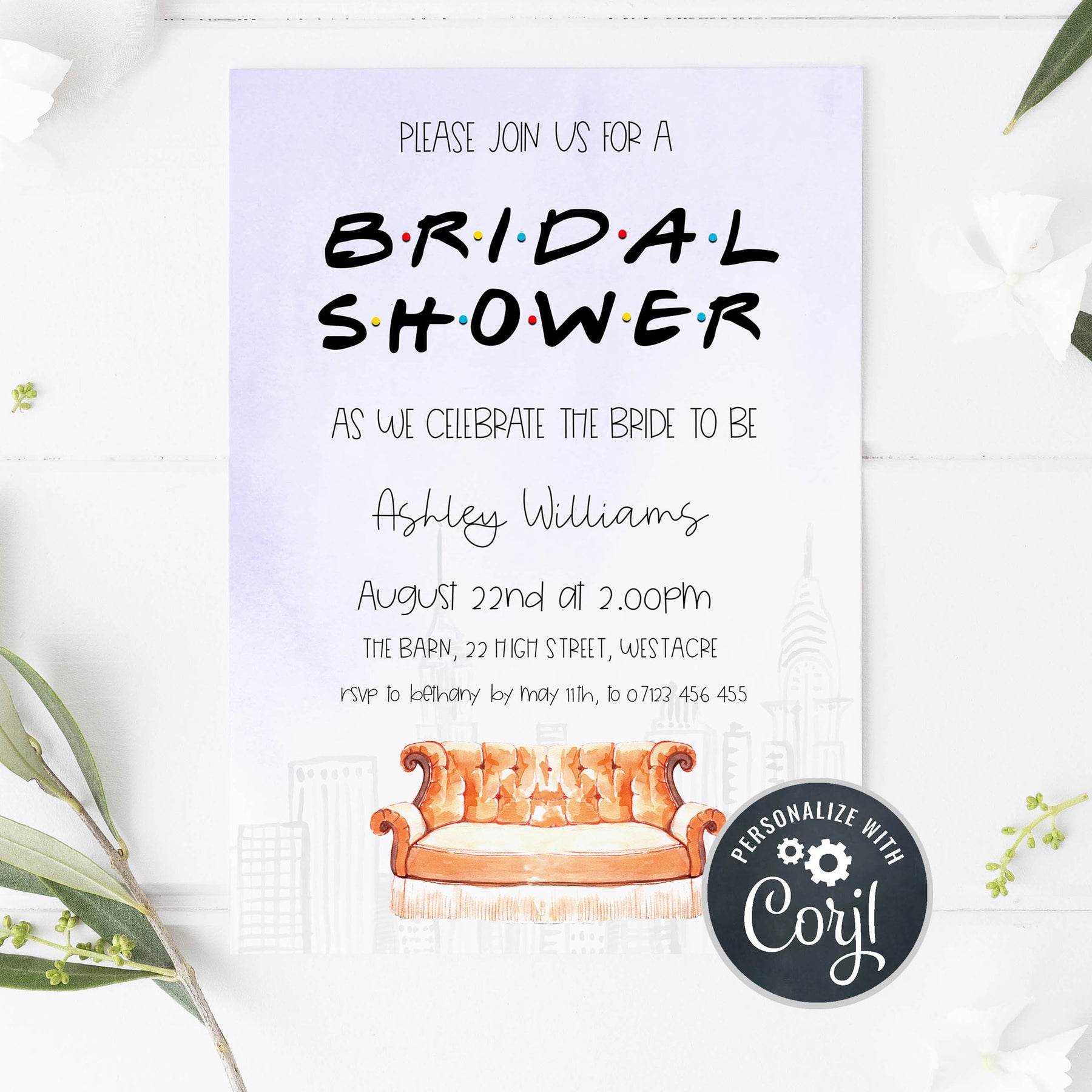 From our Friends bridal collection, this invite is the perfect start to your bridal celebrations. Edit yourself and download, it couldn't be simpler! This invitation set also includes a matching details card.