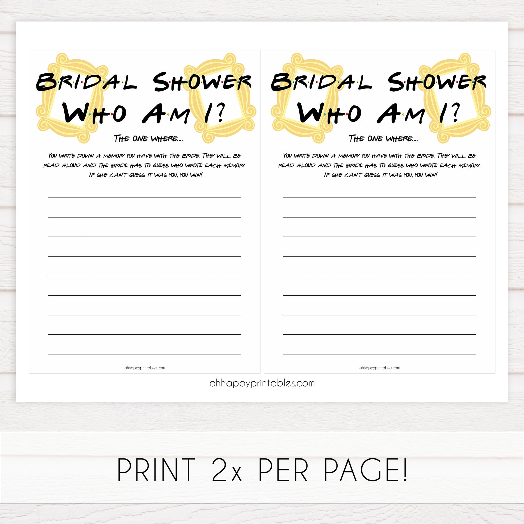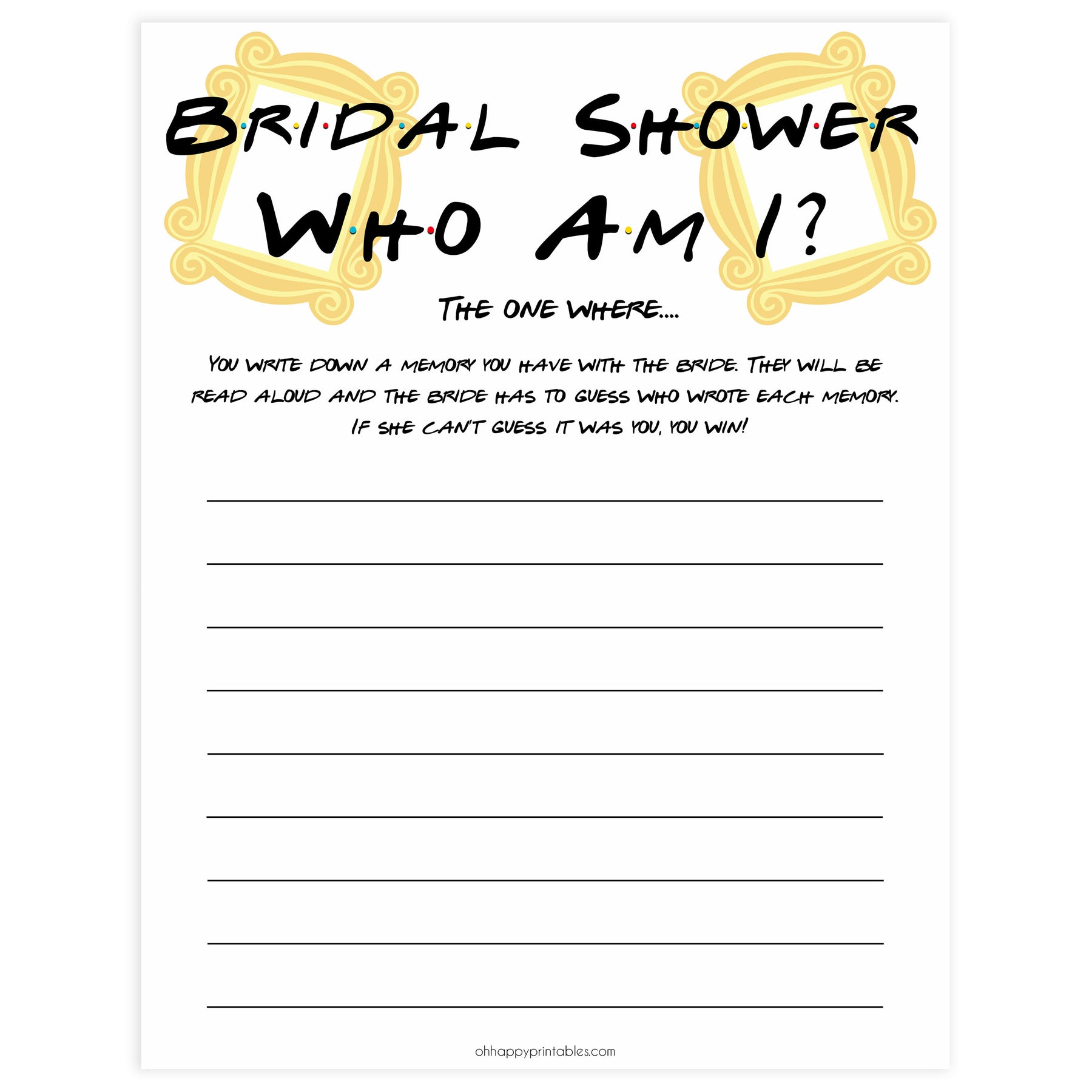 A great bridal shower game that's interactive and fun for everyone involved. Write down a memory with the bride, and she has to guess who it is! It's a great way for all the guests to get familiar with each other, and creates some fun storytimes along the way! Simply download and print at home, it couldn't be easier.