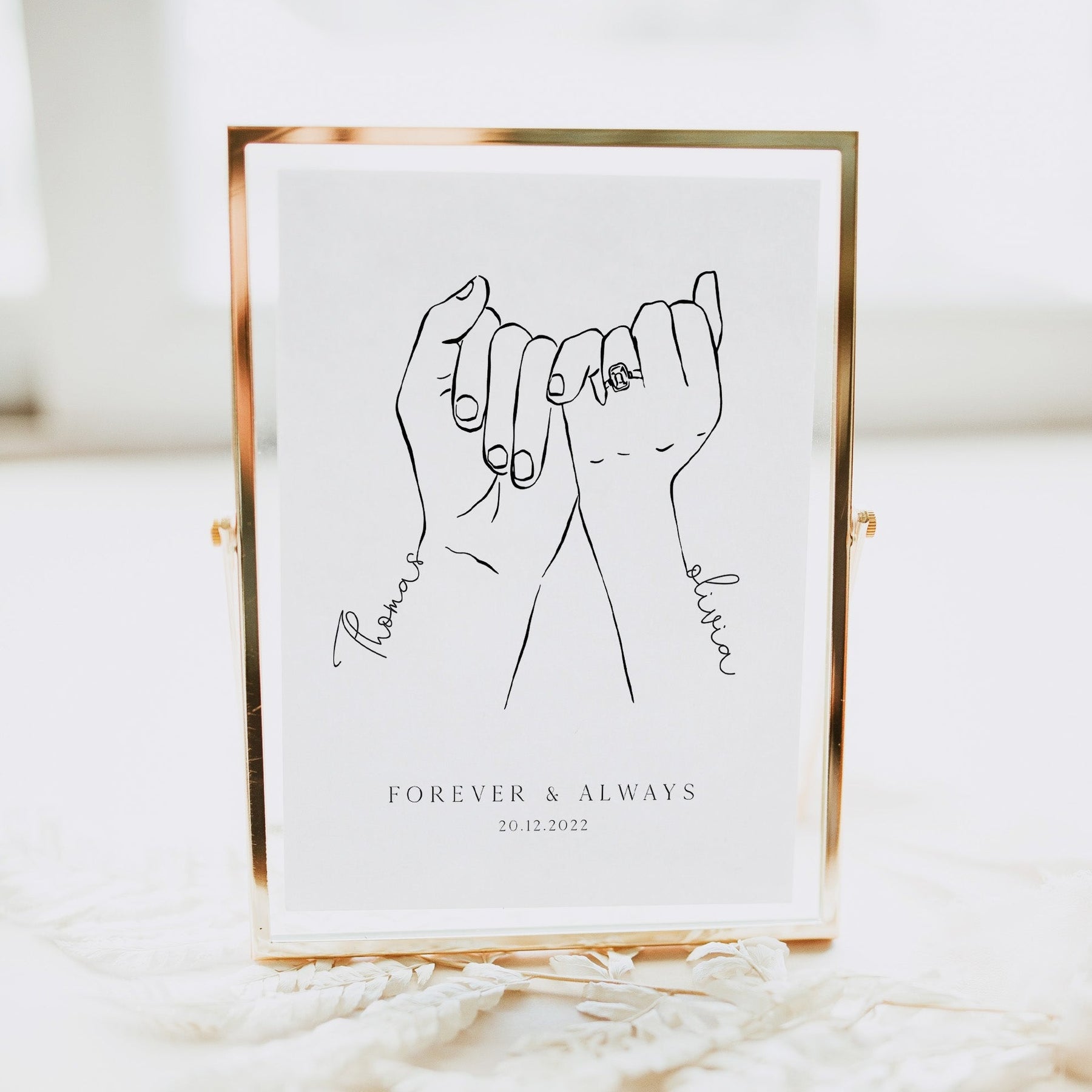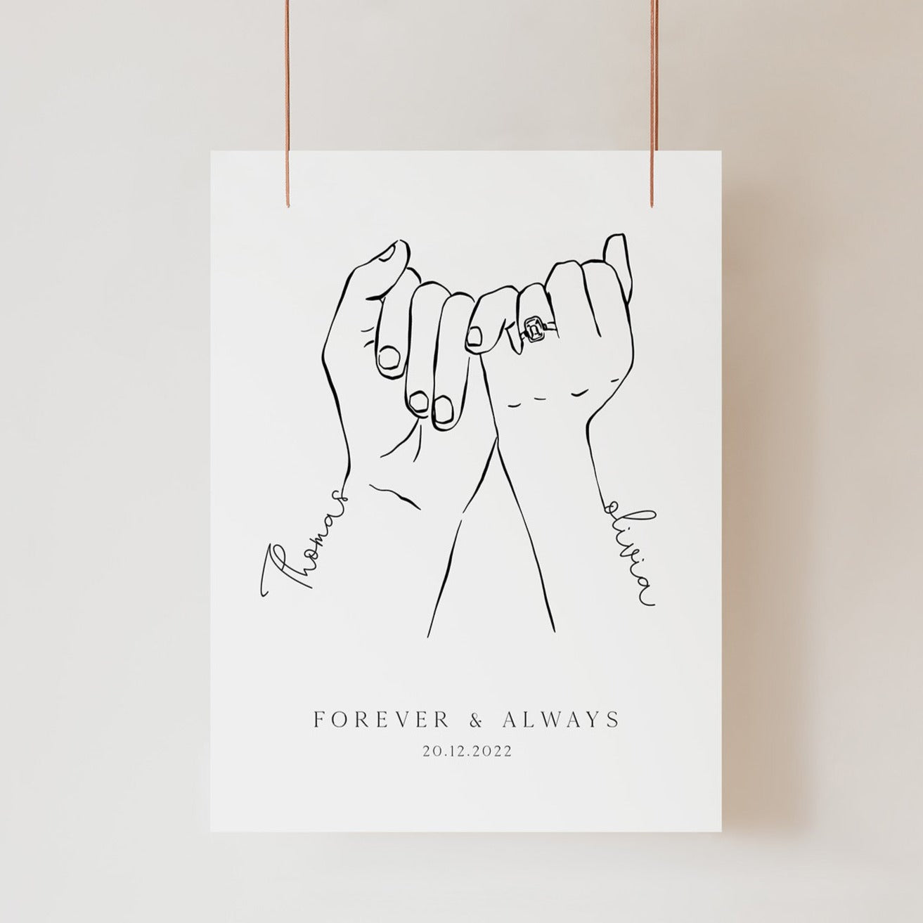 This personalised line art drawing is the perfect gift for your loved one this Valentine's Day. Showcase your love as with this elegant line drawing of two gently entwined hands, complete with your names, dates and a special saying of your choice. Add it to your wall décor in the bedroom, lounge, office, hallway or anywhere special. As it's a printable download, its a great last minute gift for your girlfriend, boyfriend, wife, or husband. Simply download and print at home, it couldn't be easier.