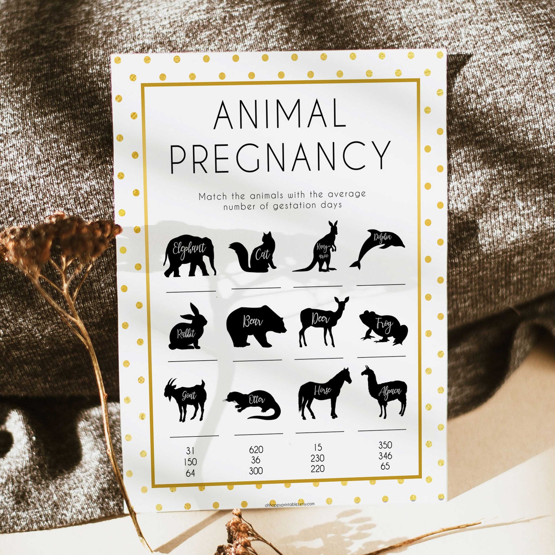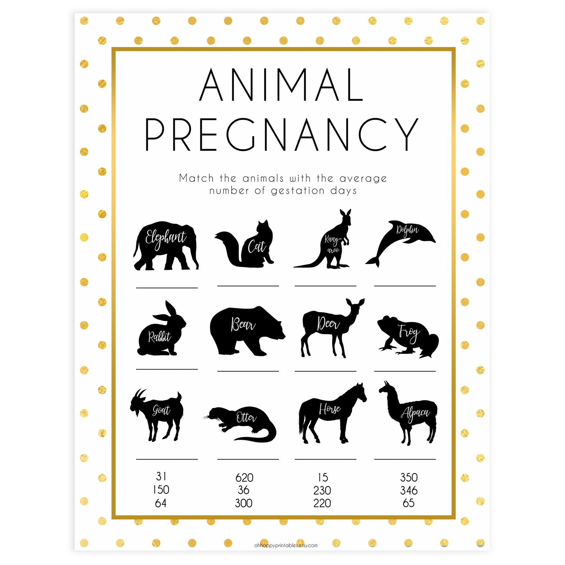 Get your friends to match the animal to the average pregnancy days. The person with the most matches wins. This is a fun one! All you need to do is download the game and print at home.
