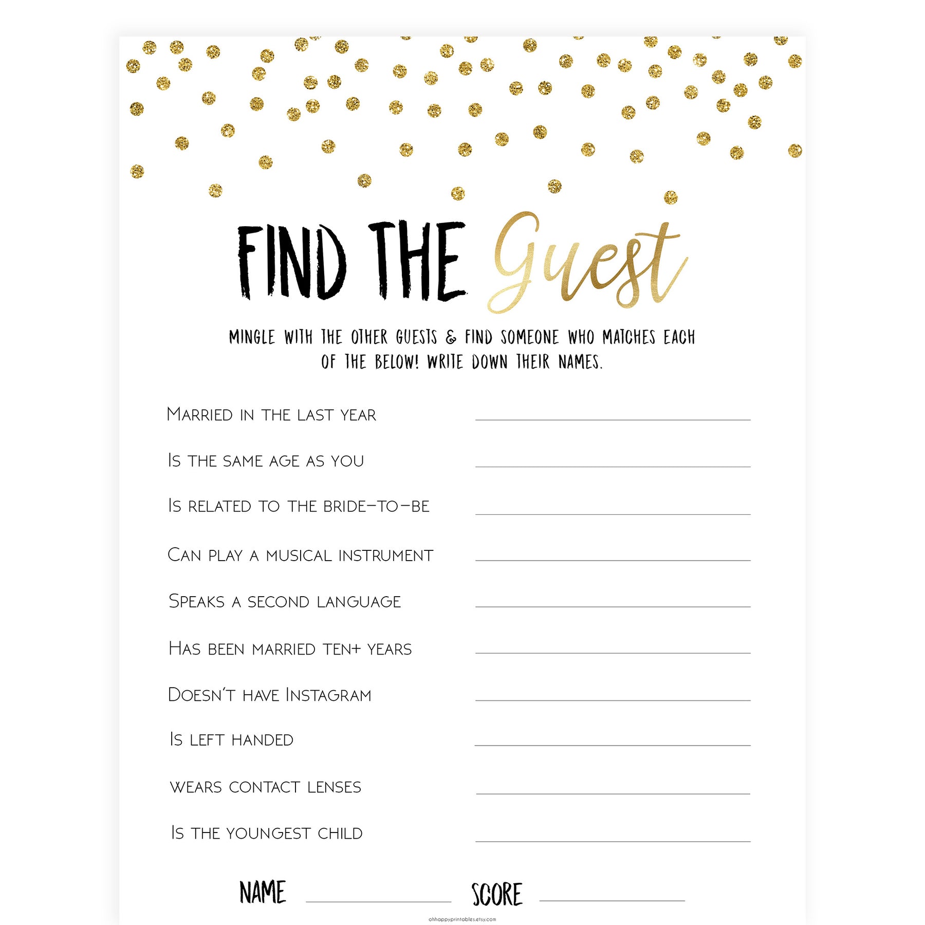 A fun party game for bachelorette/hen parties and bridal showers, Find the Guest is a great way to break the ice and get everyone mingling! Simply download and print at home.