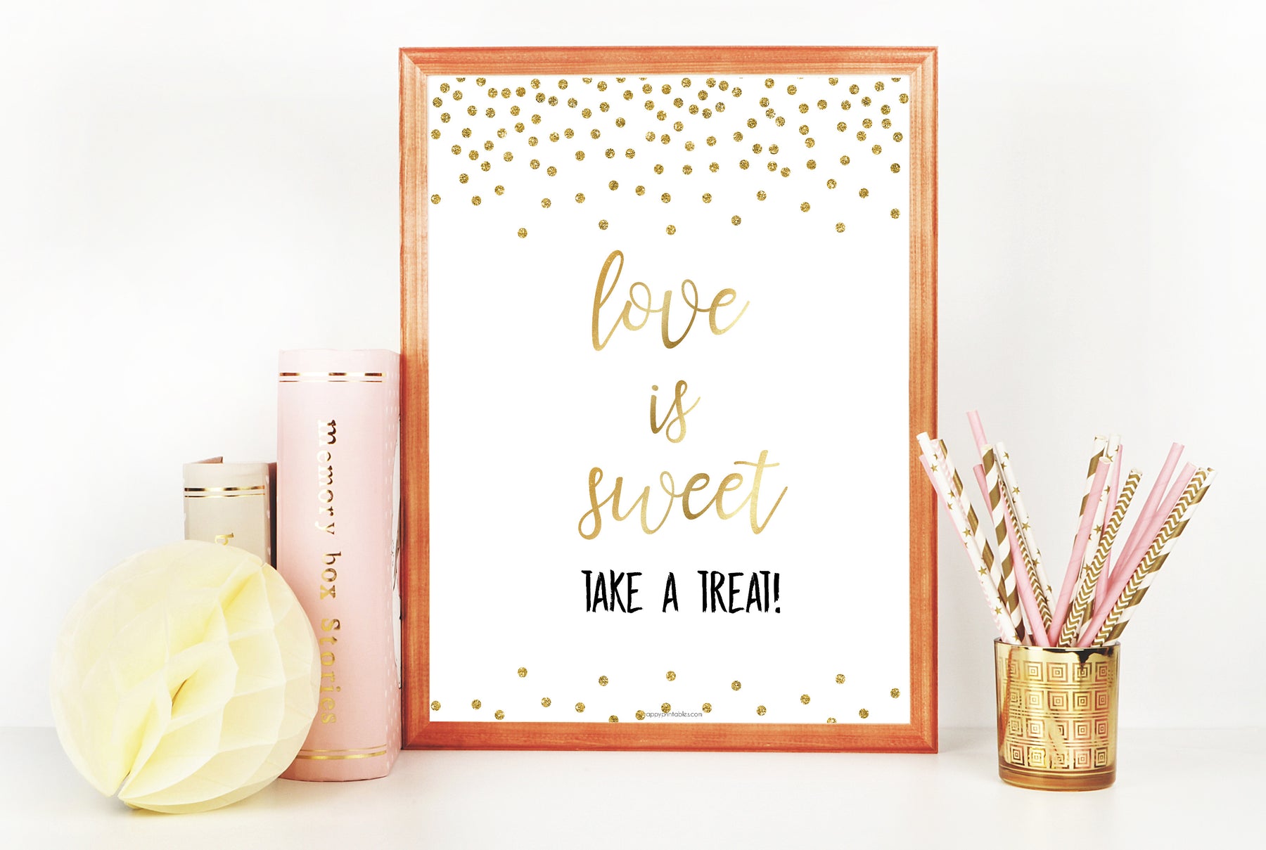 A cute idea for your favors, this Love is Sweet, Take a Treat sign will put a smile on your guests' face. Perfect for bridal showers or weddings where your favors are sweet treats! This sign fits in a frame and is ideal for putting on a table. Simply download and print at home, it couldn't be easier.