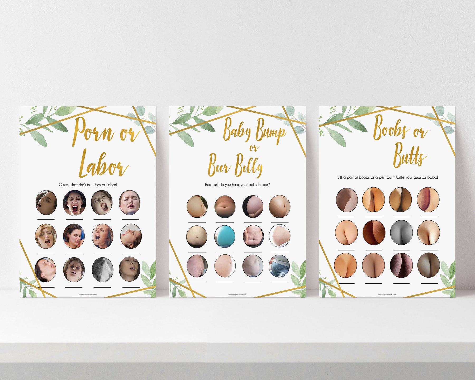 Get three of our most popular baby shower games, Porn or Labor, Baby Bump or Beer Belly, and Boobs or Butts in this amazing triple pack.
