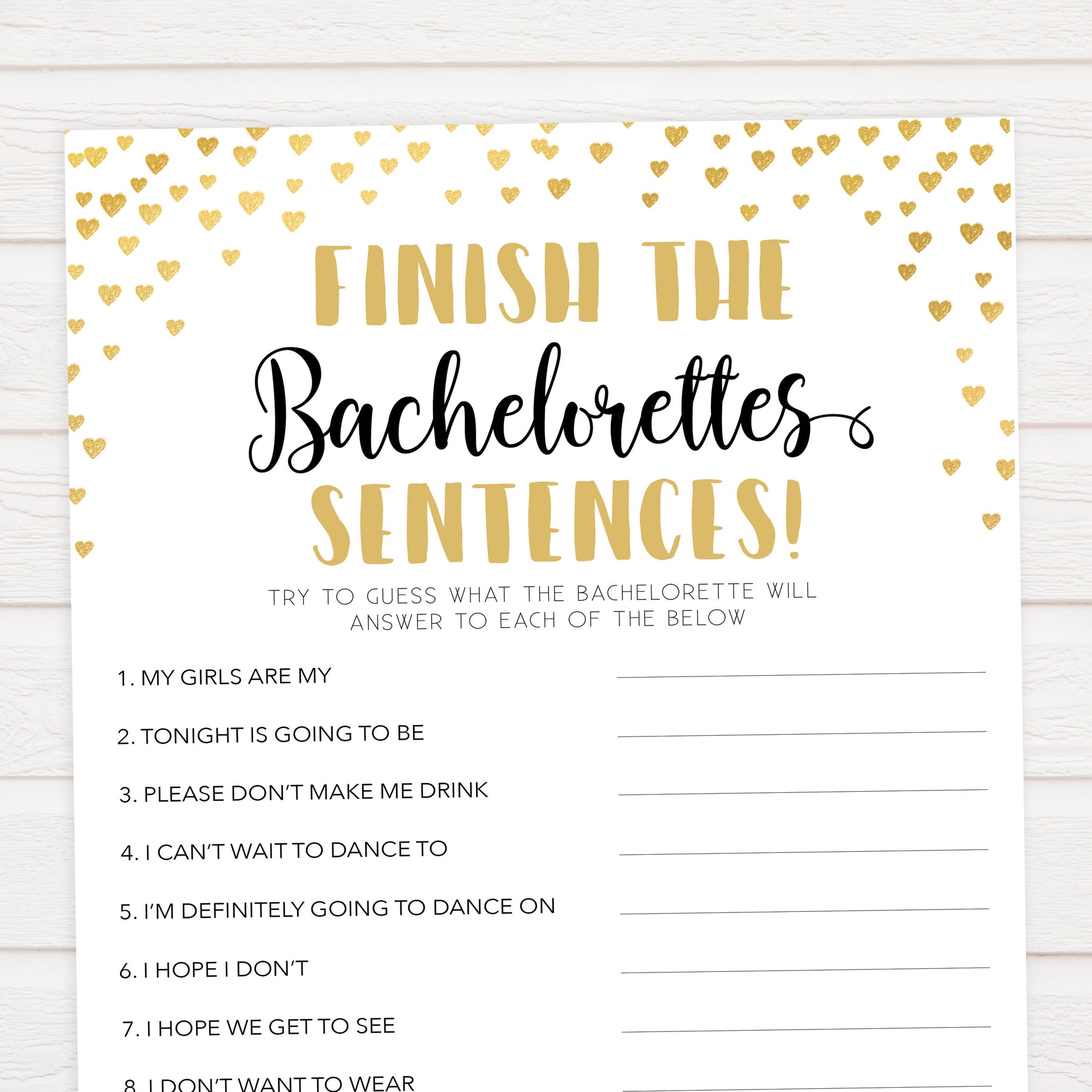 Gold hearts bachelorette games, bachelorette sentences game, printable bachelorette games, hen party games, top party games, fun bridal shower games, bachelorette party games