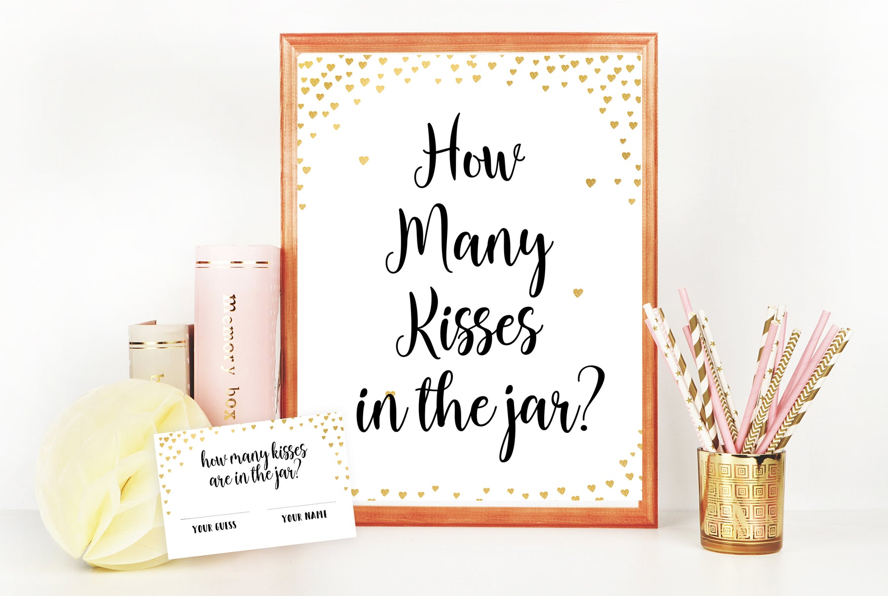 A fun and simple game that adds a little something different to your Bridal Shower. Fill a jar with Hershey's Kisses and have guests how many are in the jar. Prizes for the closest answer of course! A gorgeous decor addition to your party table that's also a bit of fun.