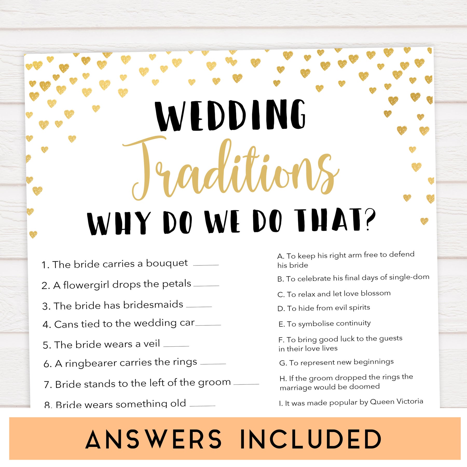 Do you know why we all throw confetti at a wedding? Or why the bride has a veil? Test your wedding knowledge with our Wedding Traditions - Why Do We Do That game. A fun bridal shower game that will get everyone thinking, and sheds some light on why you need something old and something new, something borrowed and something blue!