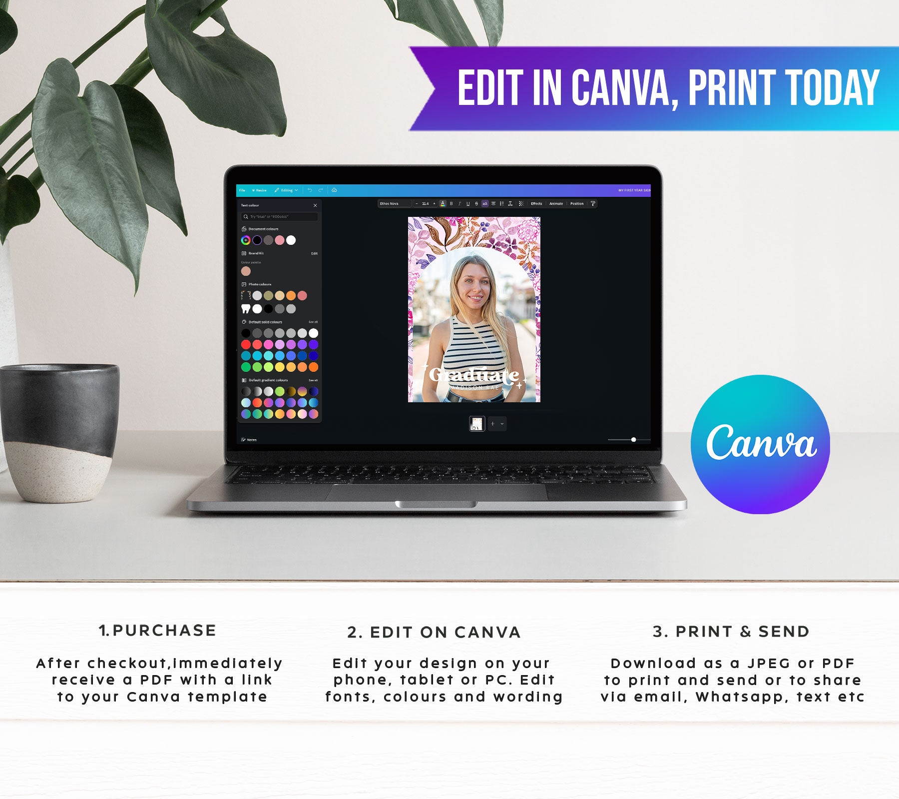 1. After purchasing download the PDF file attached to the order with your Canva link.