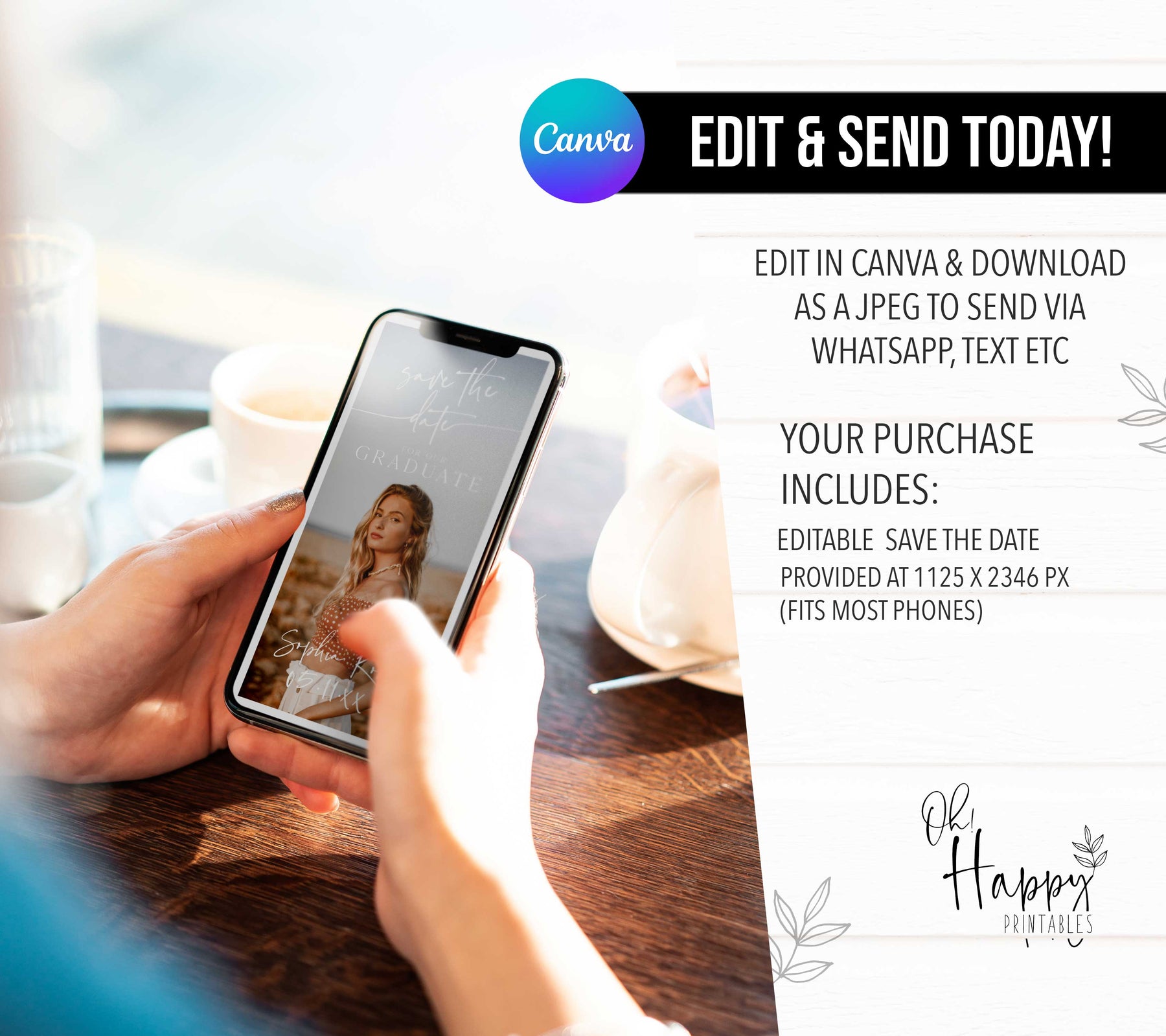 It's time to announce your amazing achievement with our Graduation Save The Date digital template! Our Digital Save The Date Graduation Invitation is the perfect way to let everyone know your graduation news. Our Graduation Save The Day has been designed to be sent via WhatsApp or Text Message, making it easy to tell all your friends and family about your graduation. Easy to edit in Canva and send today! It couldn't be easier.