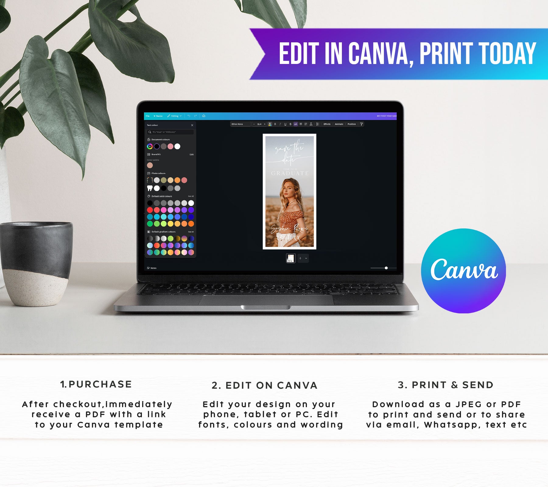 1. After purchasing download the PDF file attached to the order with your Canva link.