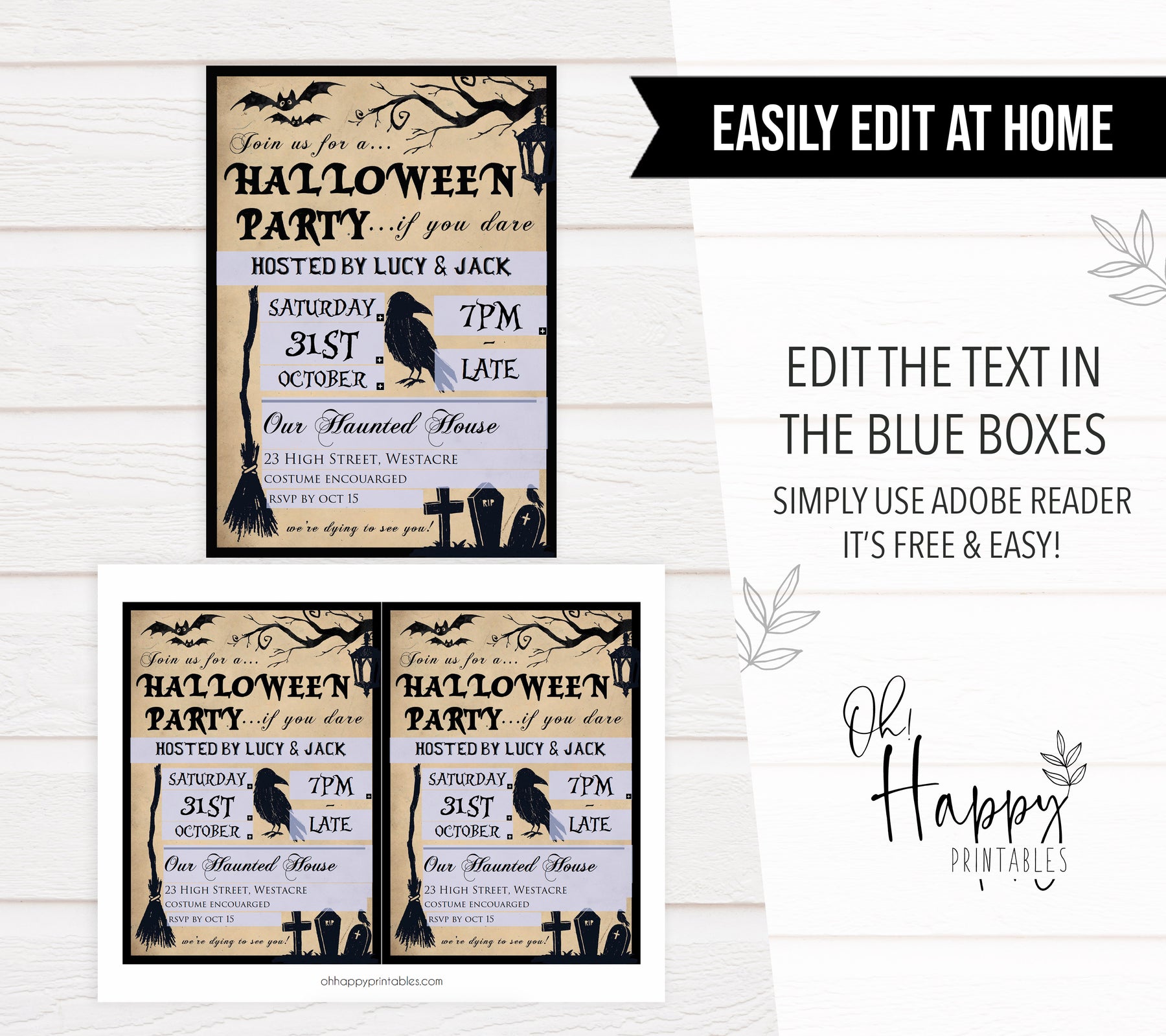 This Halloween invitation template is editable using Adobe Acrobat Reader, which comes with most computers and can be downloaded here for free.