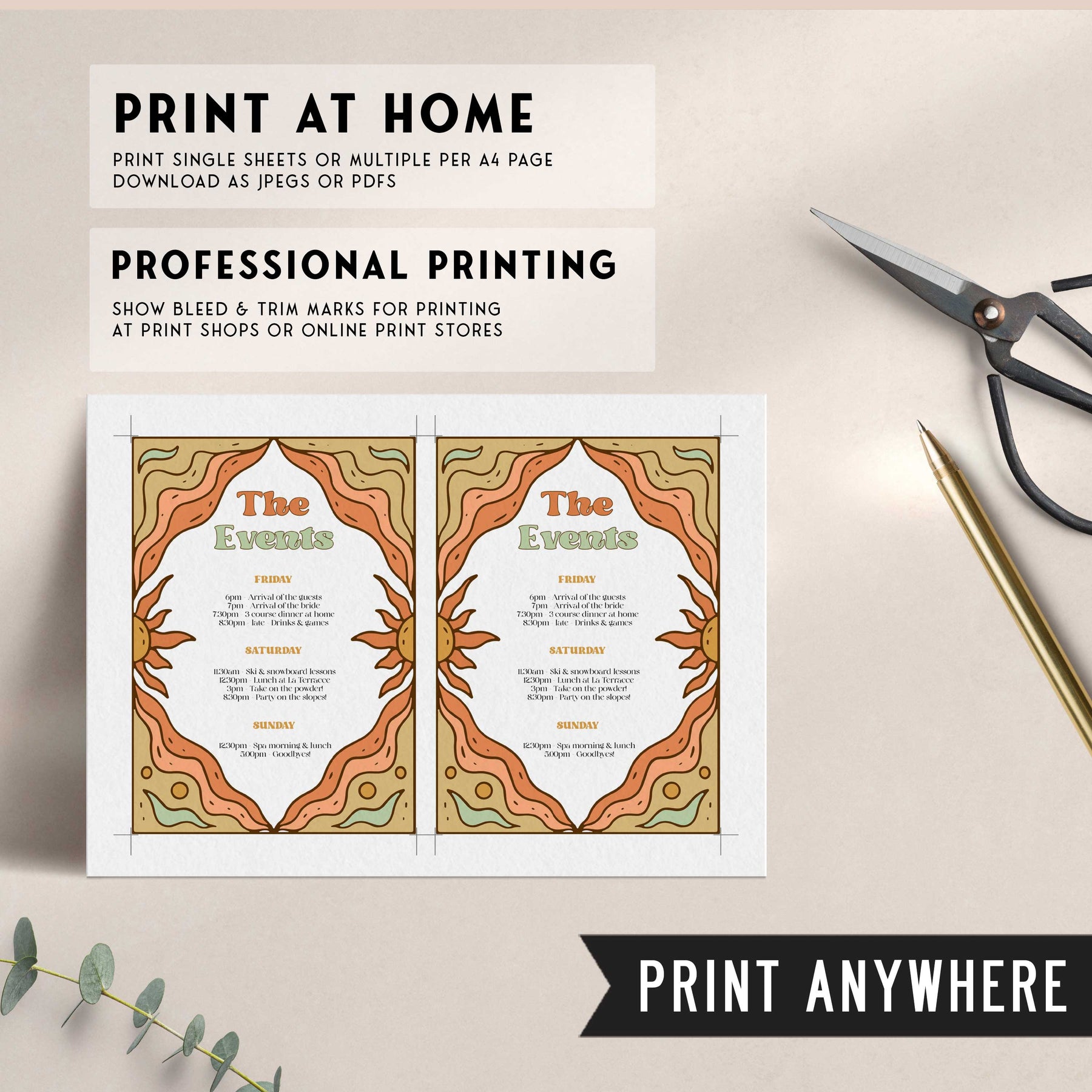 Thanks to its printable format, this itinerary can be printed at home or sent to a professional print company for a high-quality finish. So, get ready to embrace your inner gypsy and make sure your guests are in the know with our 60s Gypsy Boho-inspired editable bridal shower itinerary!