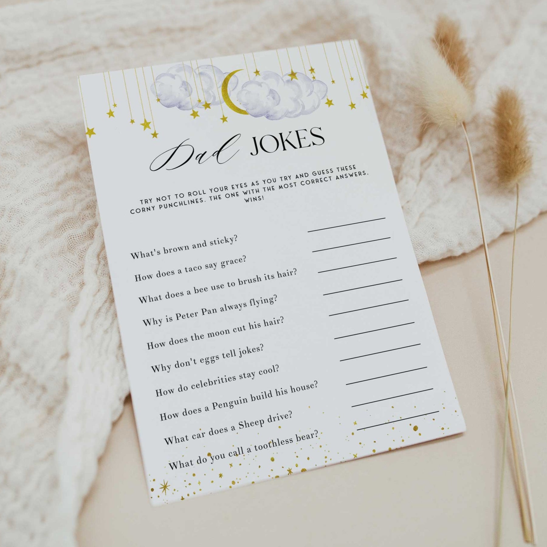 Make your baby shower extra fun with the Dad Jokes baby shower game. All your friends will love this printable baby shower game, simply download and print as many copies as you need. It couldn’t be easier. Fun pregnancy-themed games for your baby shower.
