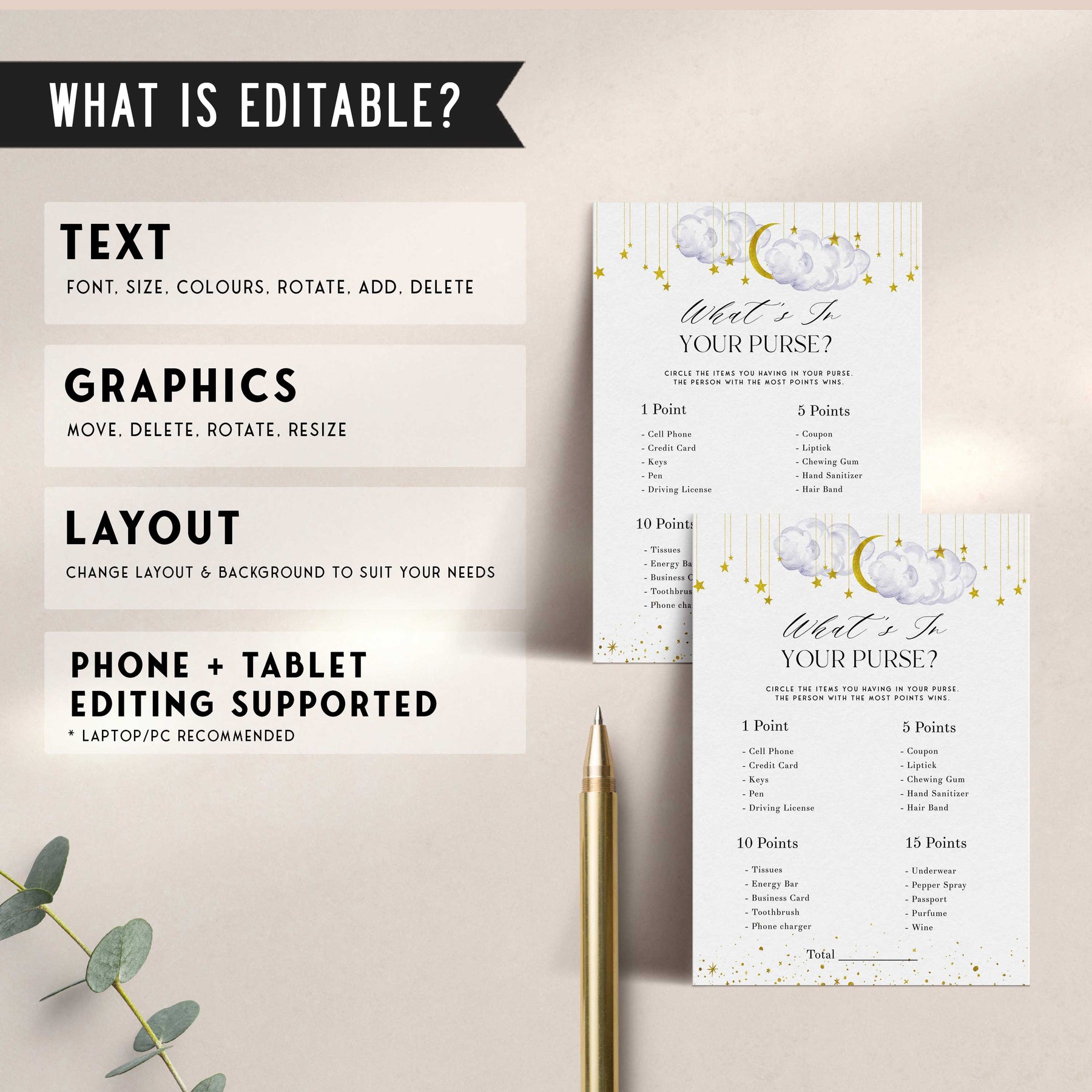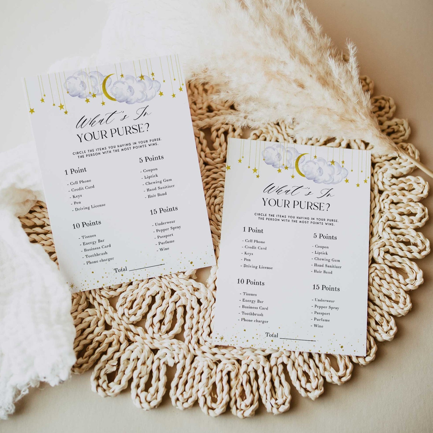 Fully editable and printable baby shower what's in your purse game with a little star design. Perfect for a Twinkle Little Star baby shower themed party