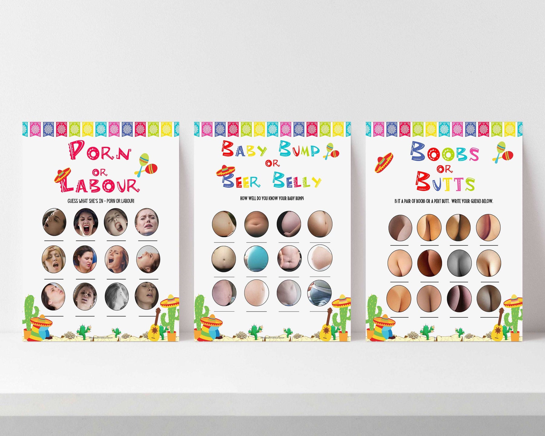 Get three of our most popular baby shower games, Porn or Labor, Baby Bump or Beer Belly, and Boobs or Butts in this amazing triple pack.