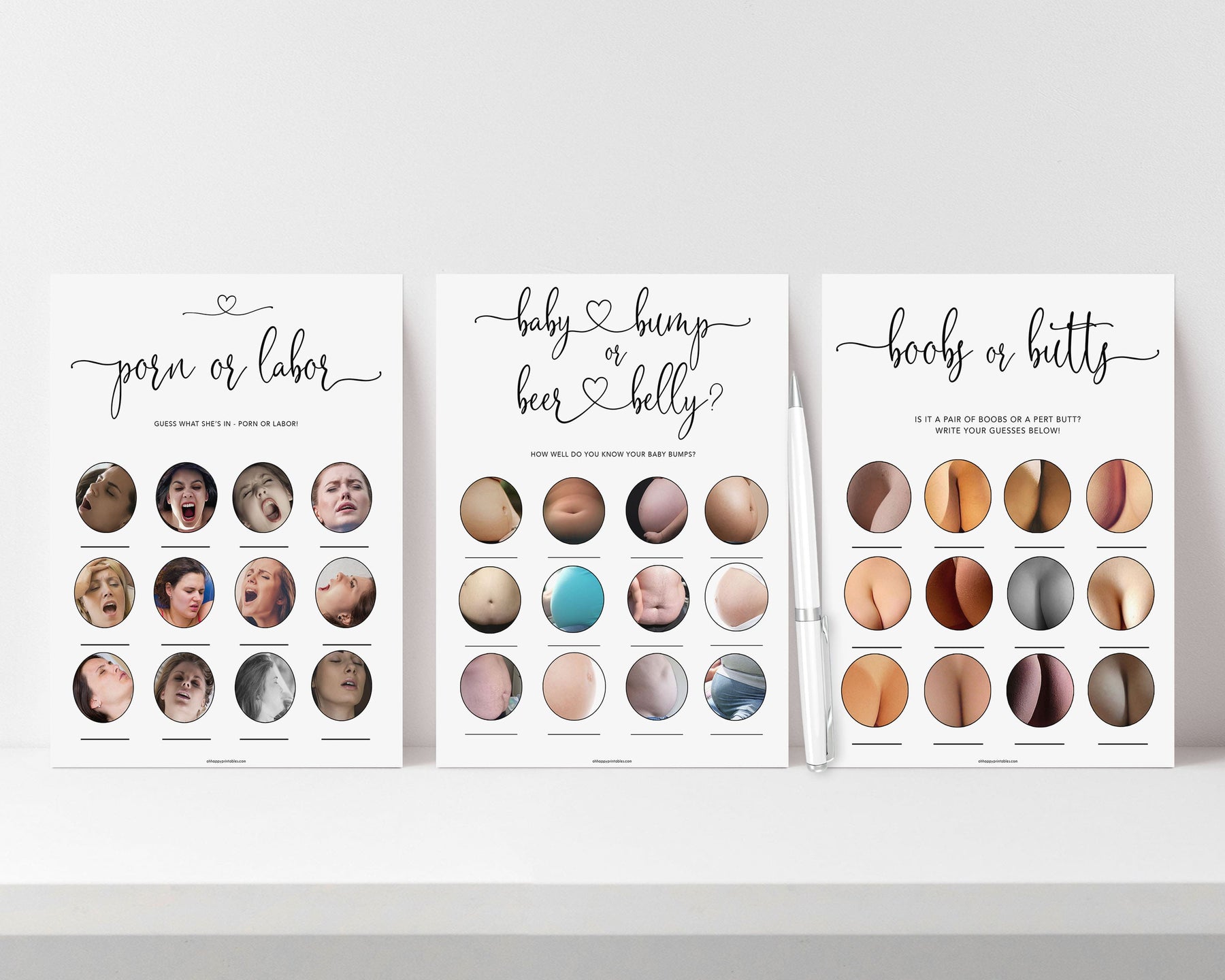 Get three of our most popular baby shower games, Porn or Labor, Baby Bump or Beer Belly, and Boobs or Butts in this amazing triple pack.