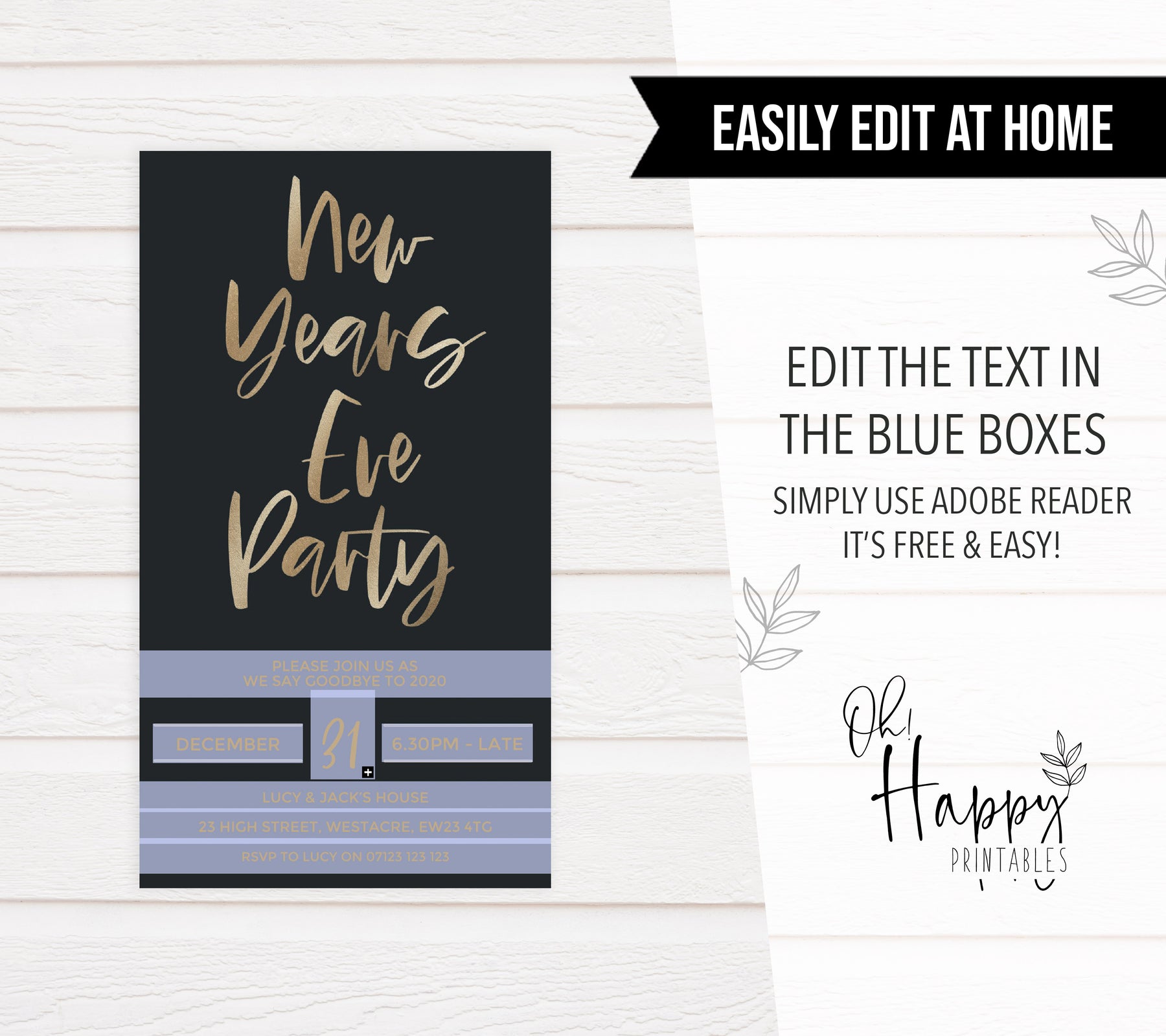This New Years Eve invitation template is editable using Adobe Acrobat Reader, which comes with most computers and can be downloaded here for free.