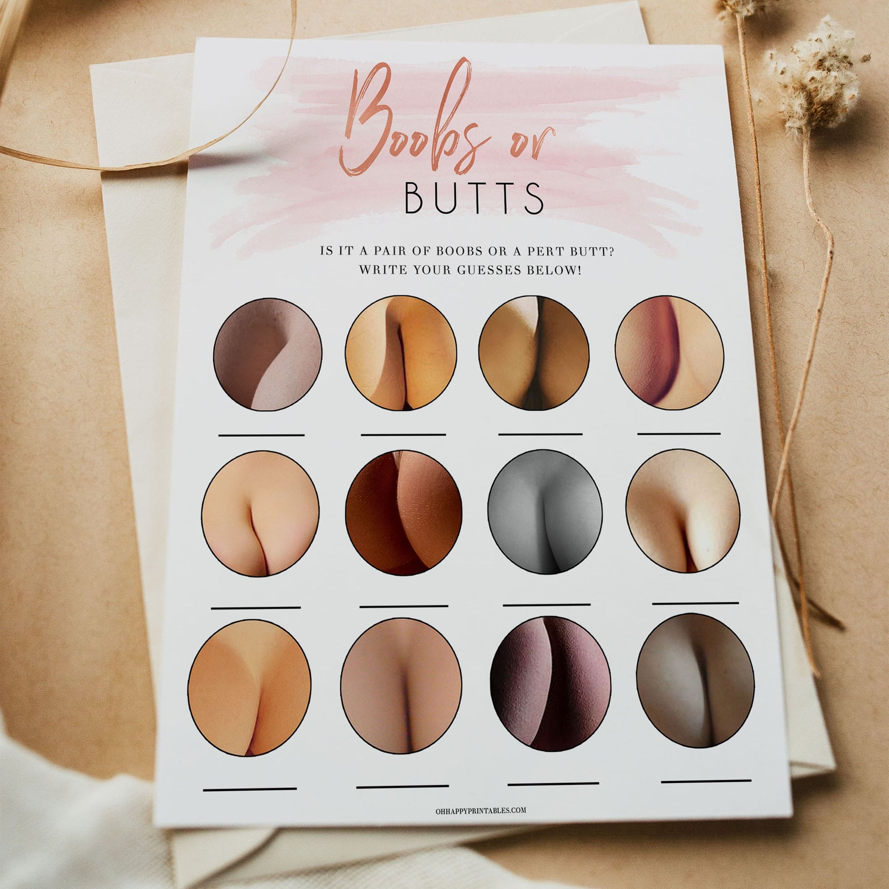 Our printable Boobs or Butts game is a hilarious baby shower game that's perfect for those who like to have a bit of fun! Guess whether the picture is a pair of womans boobs or a butt. Our printable Boobs or Butts game comes complete with answer sheet. All you need to do is download and print at home, it couldn't be easier.