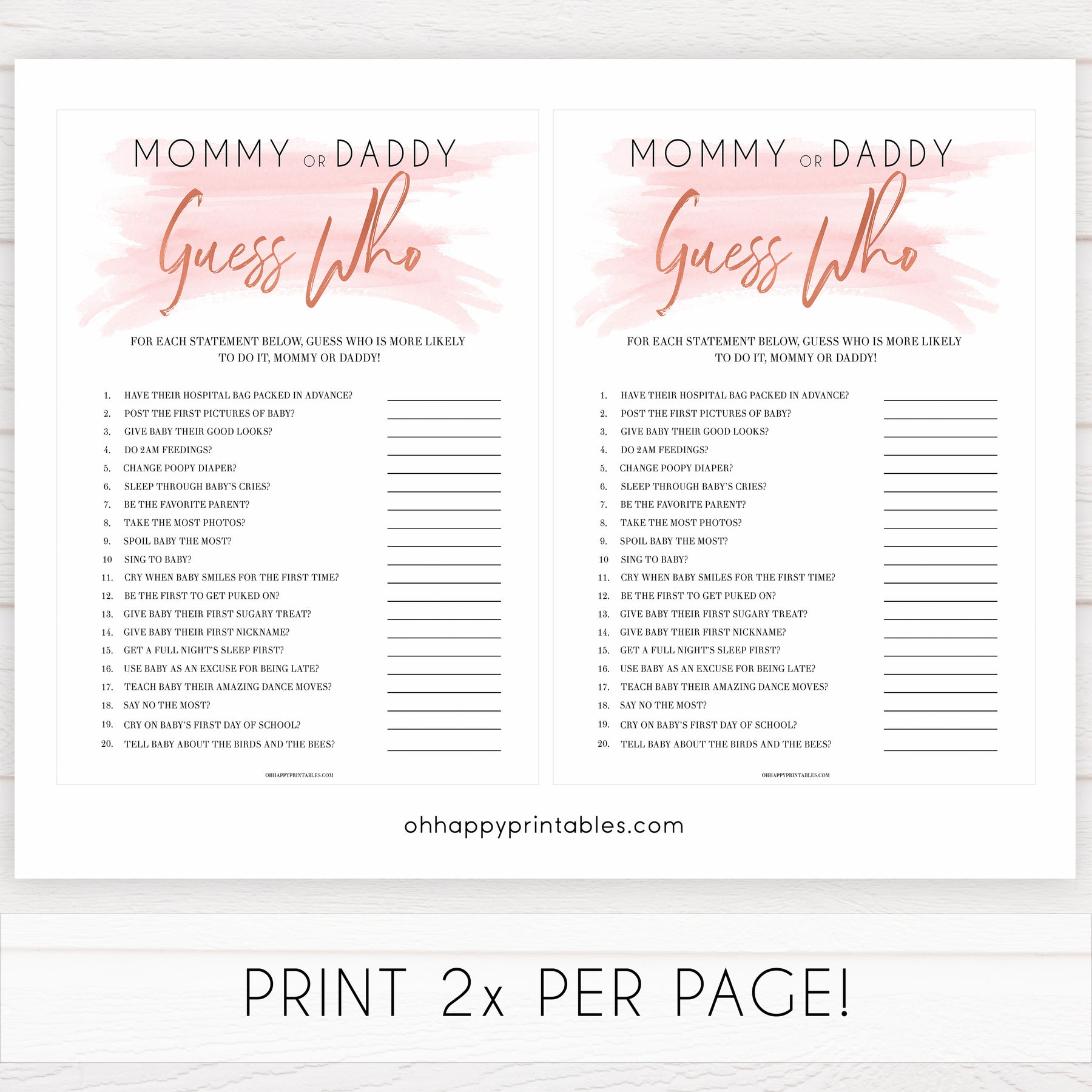 pink swash mommy or daddy guess who game, baby shower games, printable baby shower games, fun baby shower games, popular baby shower games