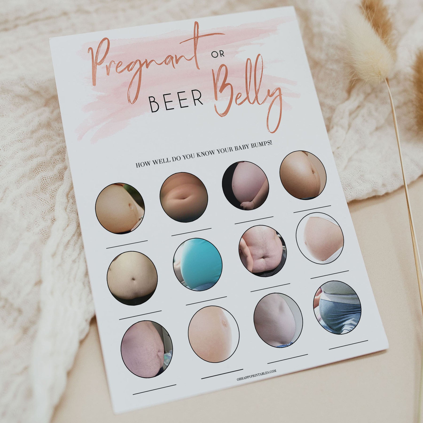 Our printable Pregnant or Beer Belly game is a hilarious baby shower game that's perfect for those who like to have a bit of fun! Guess whether the picture is of baby bump, or a belly full of beer! Our Pregnant or Beer Belly game comes complete with answer sheet, and is available in two sizes. All you need to do is download and print at home, it couldn't be easier.