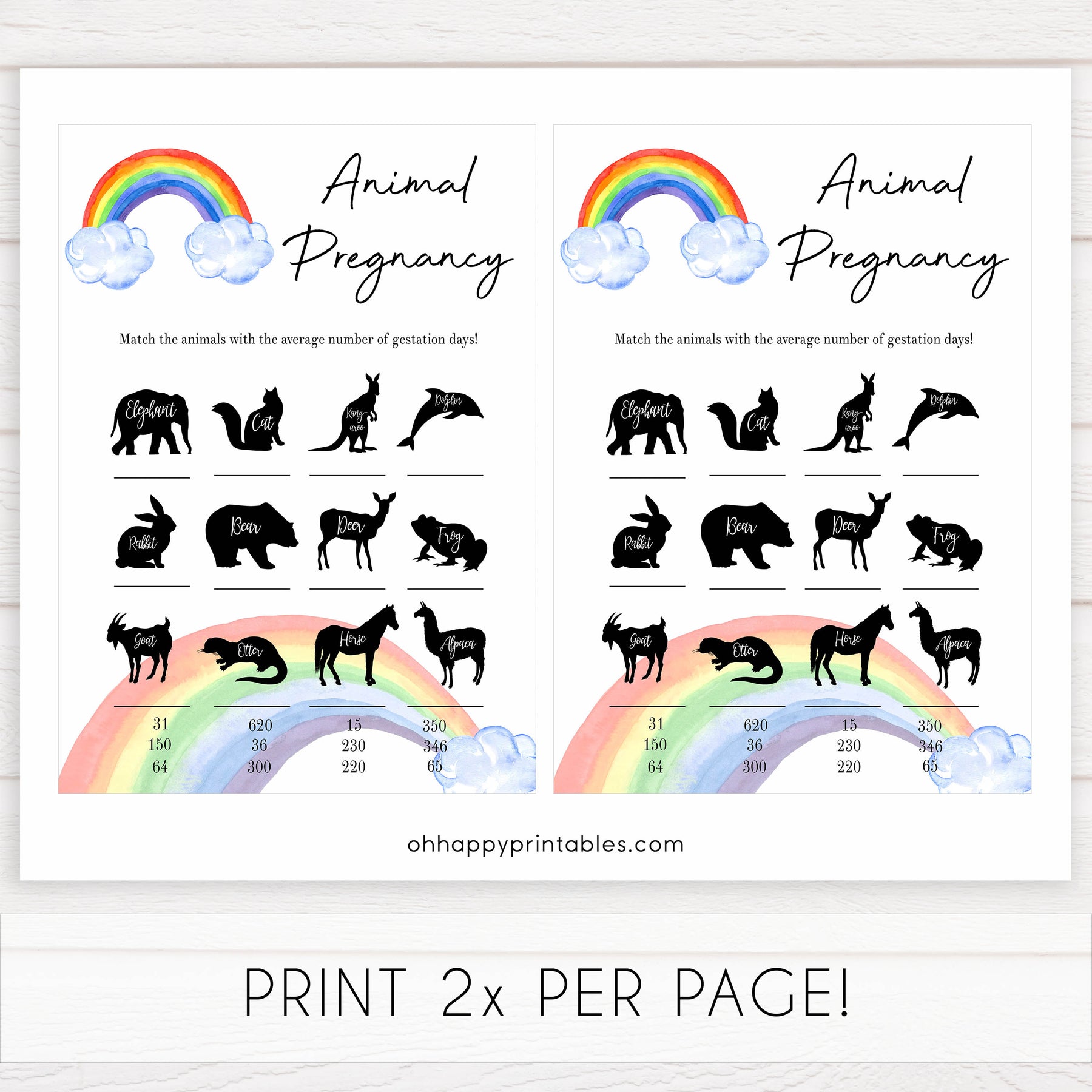 Get your friends to match the animal to the average pregnancy days. The person with the most matches wins. This is a fun one! All you need to do is download the game and print at home.