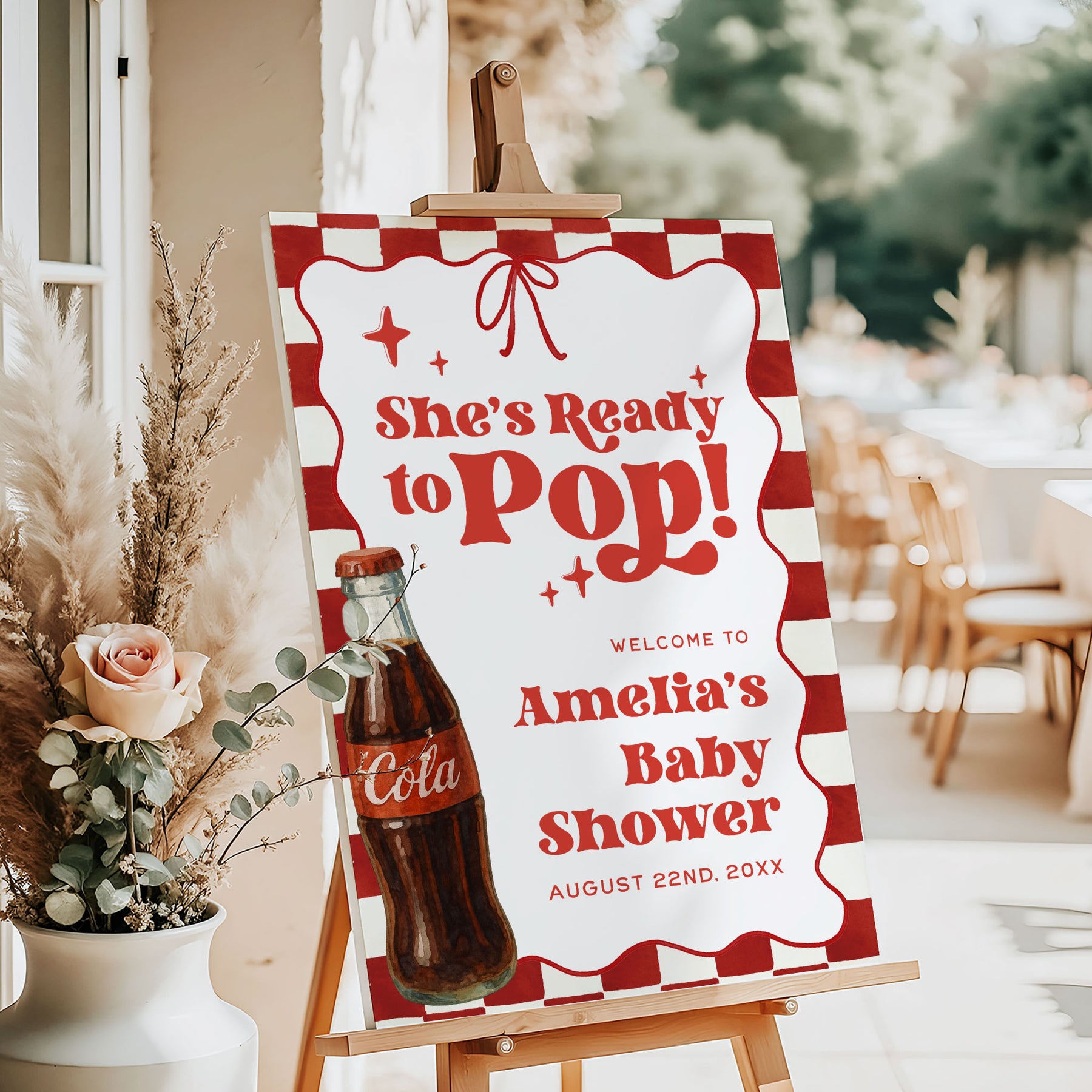 Introducing our editable She's Ready To Pop Baby Shower Welcome Sign Canva editable template. This is the perfect addition to your baby shower. Easy to edit in Canva and send or print today! It couldn't be easier.