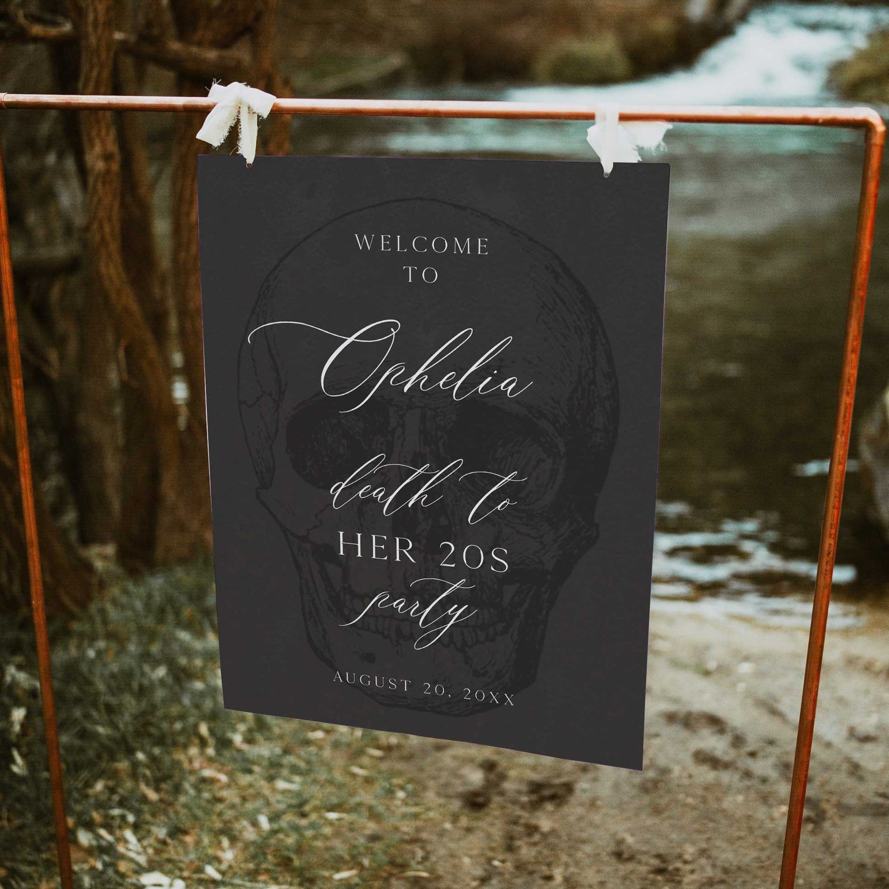 death to my twenties welcome sign with skull. Fully editable death to my 20s birthday welcome sign