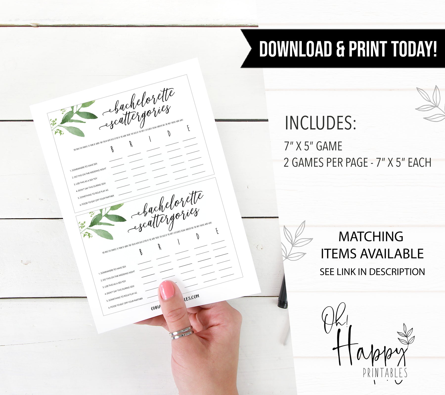 Dirty Scattergories is a naughty take on the classic game. Can you provide unique answers for the dirty categories? This is a fun bachelorette game where you can let your imagination go wild. Simply download and print at home, it couldn't be easier.
