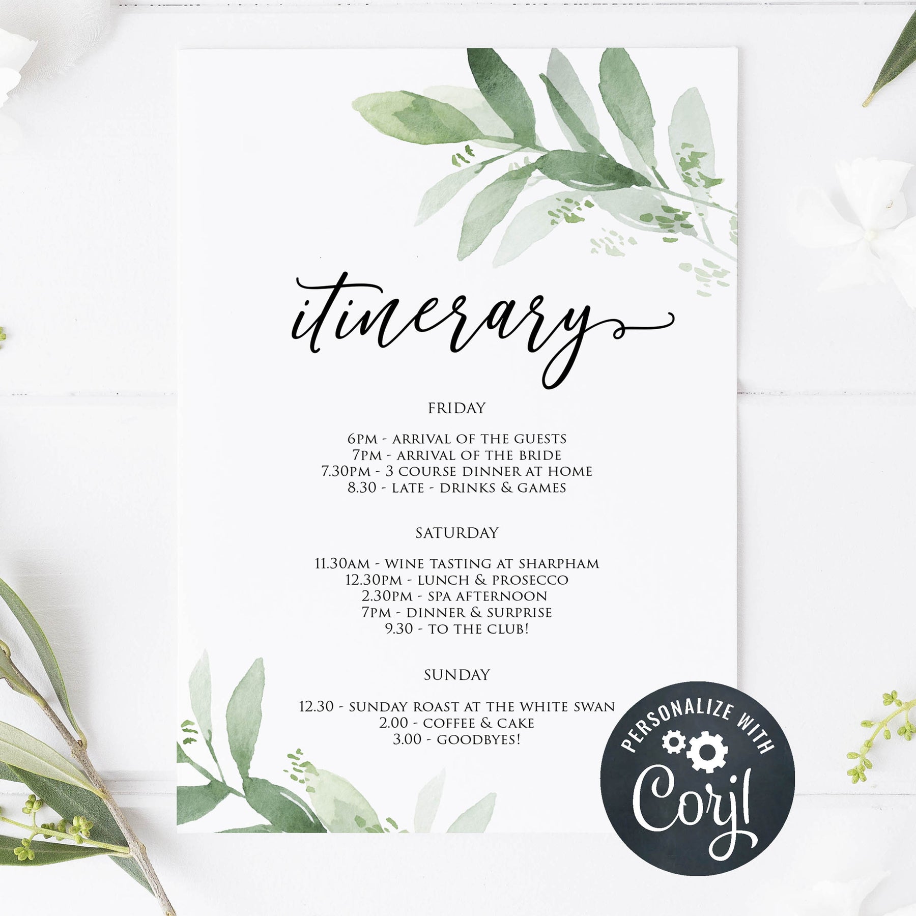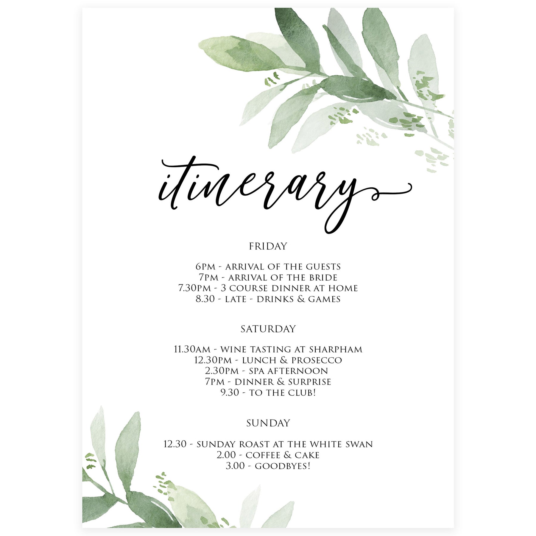 From our best-selling Greenery collection, this itinerary features beautiful botanical illustrations and elegant calligraphy lettering. Download immediately and edit yourself, it couldn't be simpler! Perfect for letting your guests know what an amazing weekend they're about to have!