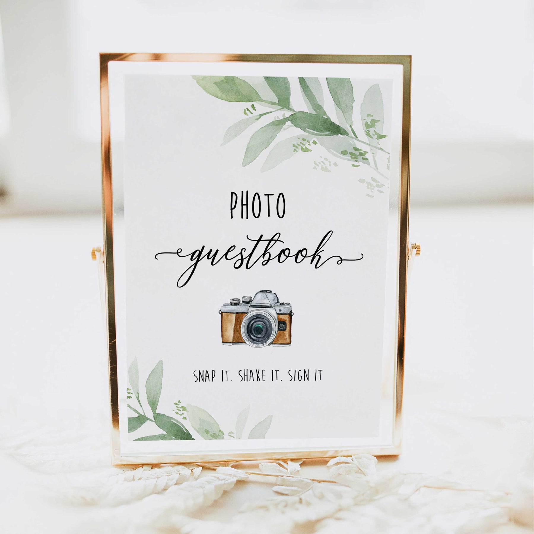 Snap it, shake it, and sign it! Polaroid guestbooks are a unique way to keep special memories alive of your big day. Get your guests to snap a photo of themselves, and you get to keep the photo as a memento. This cute table sign is perfect for putting into a frame for any table display. Download and print at home, it couldn't be easier.