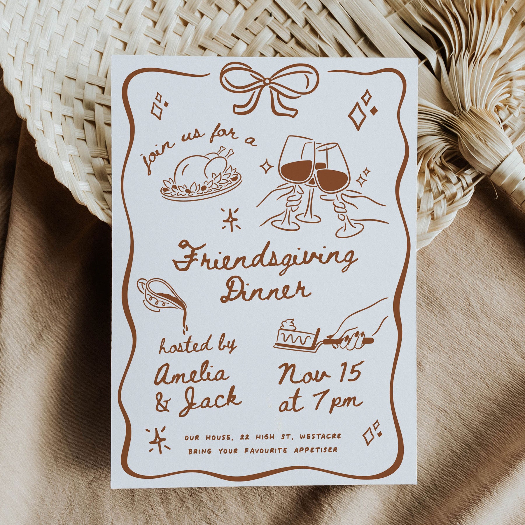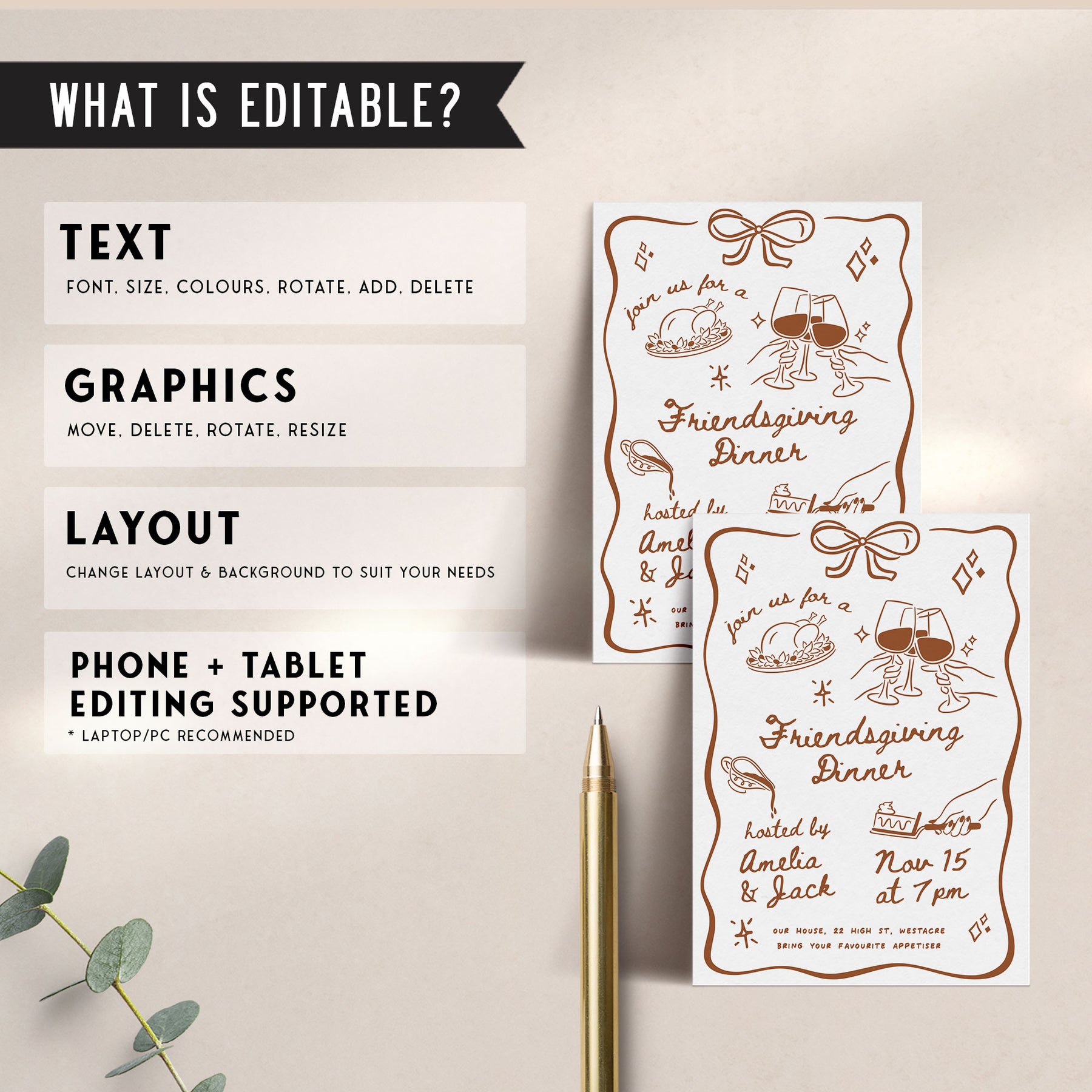 Make your Thanksgiving celebration extra special with our Editable Thanksgiving Dinner Invitation Set. Adorned with cozy autumn-themed illustrations. Customize the text to include your name, event details, and a warm holiday message. Whether you choose to print or share digitally, our versatile set offers convenience and a festive touch for any Friendsgiving or Thanksgiving gathering.