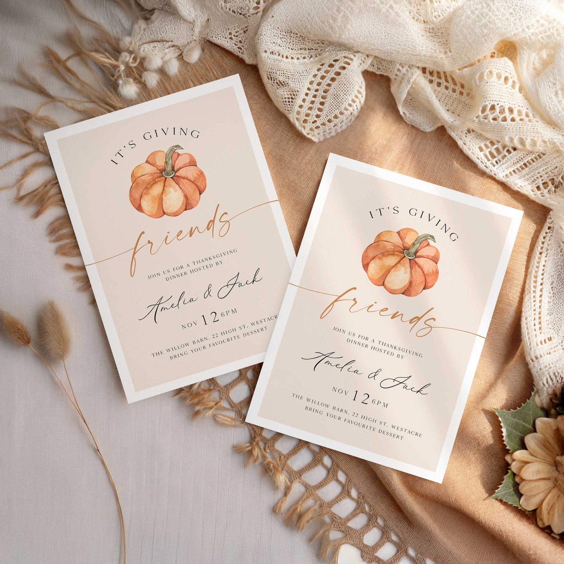 Make your Thanksgiving celebration extra special with our Editable Thanksgiving Dinner Invitation Set. Adorned with cozy autumn-themed illustrations. Customize the text to include your name, event details, and a warm holiday message. Whether you choose to print or share digitally, our versatile set offers convenience and a festive touch for any Friendsgiving or Thanksgiving gathering.