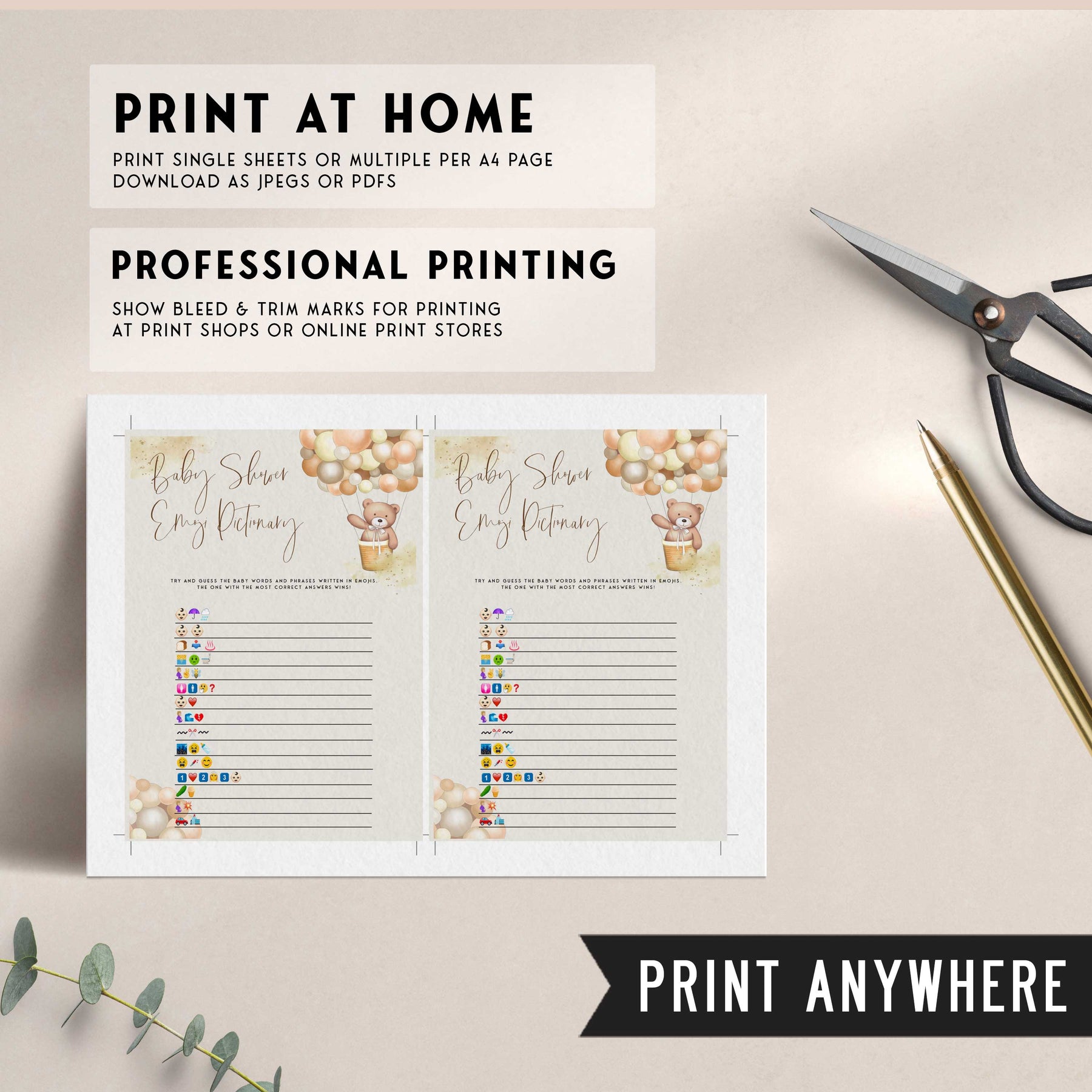 Fully editable and printable baby shower childrens books emoji pictionary game with a hot air balloon teddy bear, we can bearly wait design. Perfect for a We Can Bearly Wait baby shower themed party