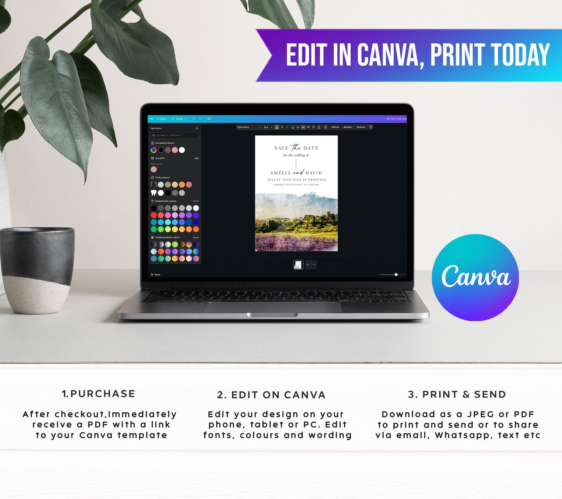 1. After purchasing download the PDF file attached to the order with your Canva link.