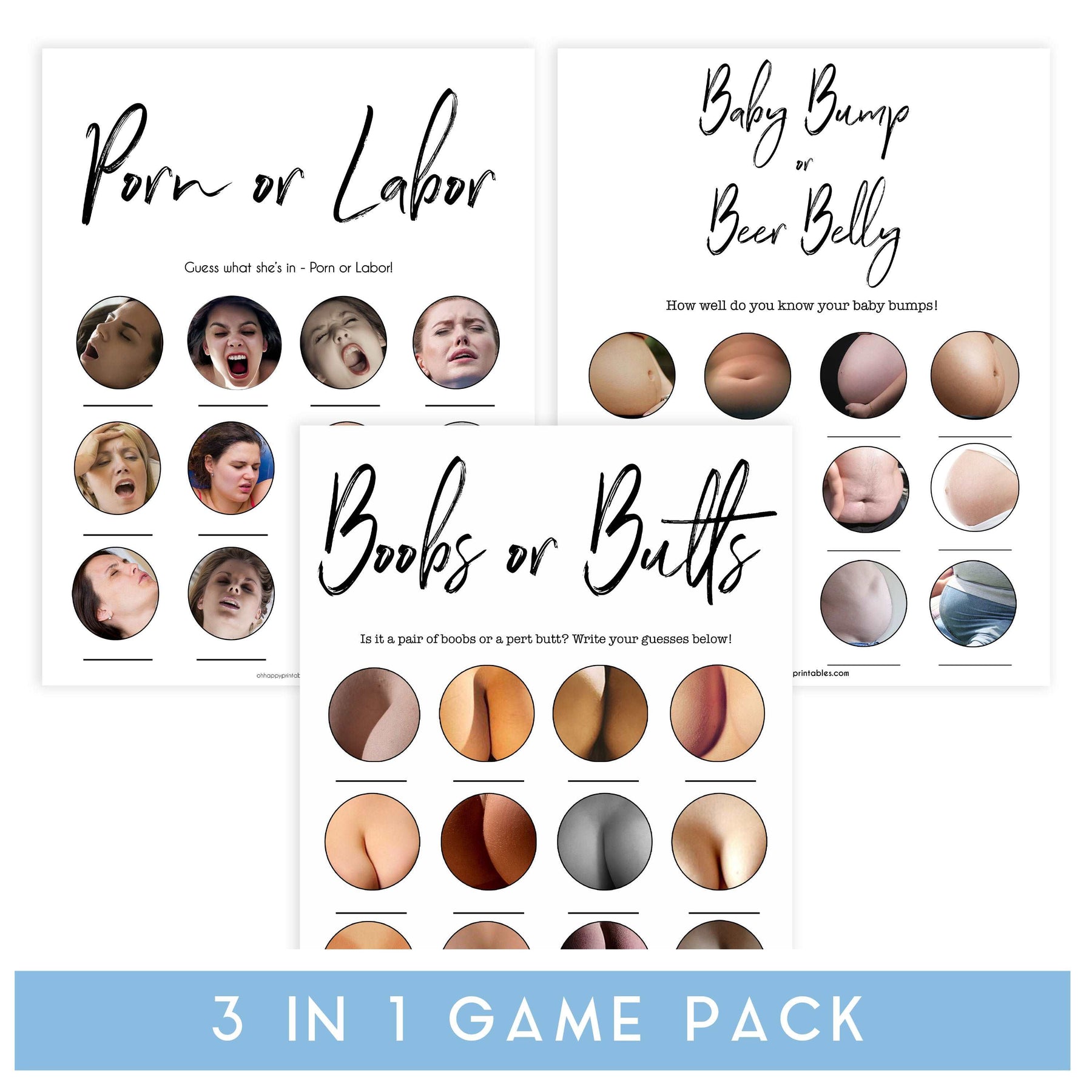 Get three of our most popular baby shower games, Porn or Labor, Baby Bump or Beer Belly, and Boobs or Butts in this amazing triple pack.
