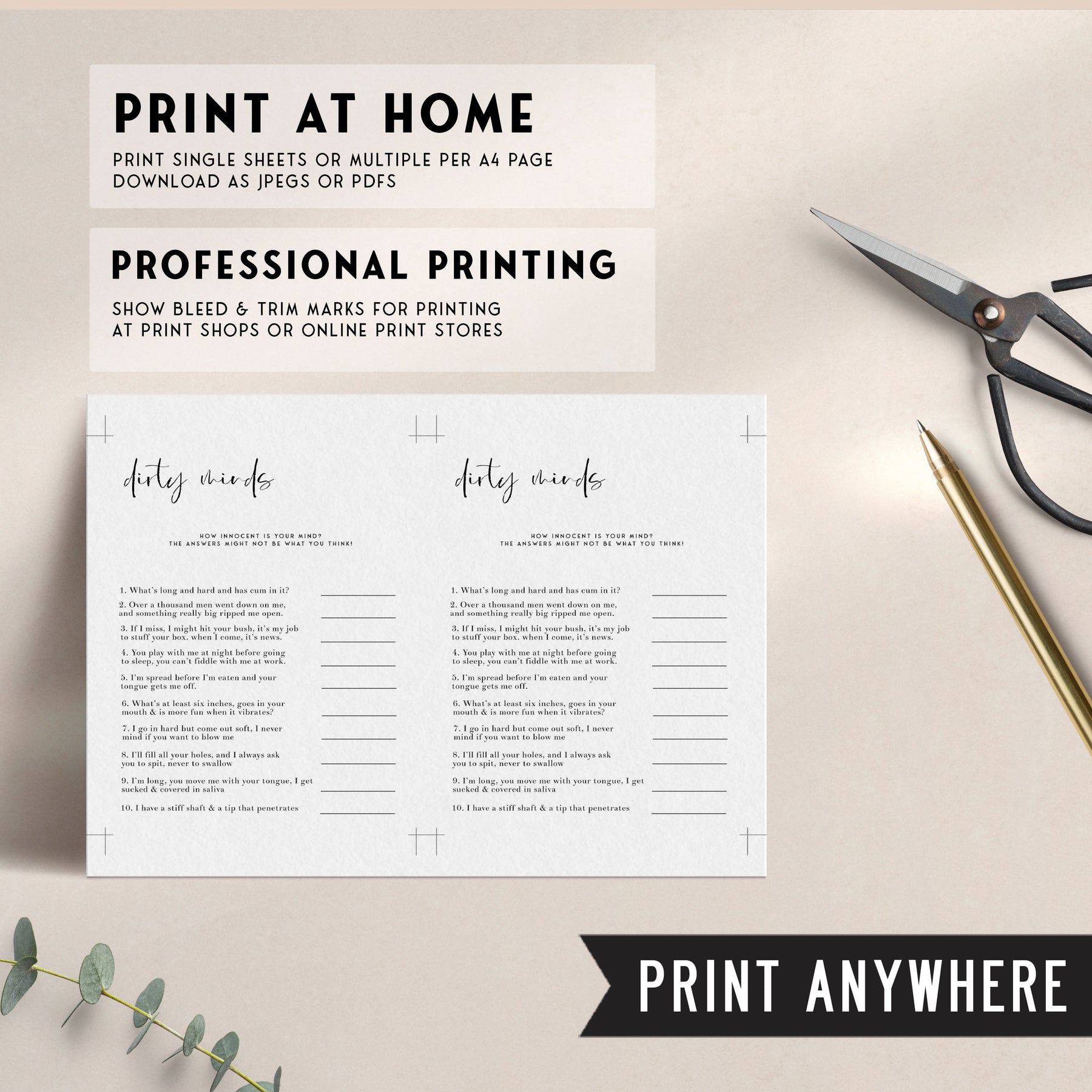 Can you guess the innocent answers from the rather naughty clues? If you have a dirty mind, some of the real answers might be impossible to guess! A hilarious game for a Bachelorette party that will have everyone in stitches.