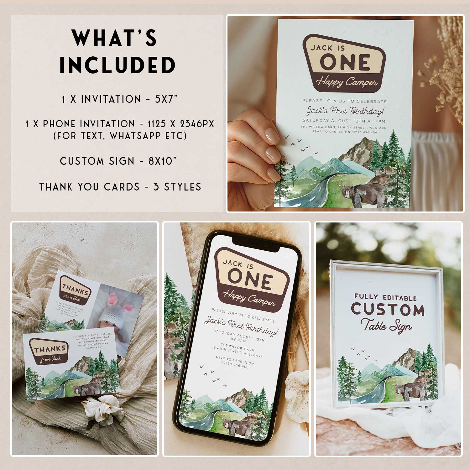 Celebrate your little one's monumental first year with our One Happy Camper FIRST BIRTHDAY Party Bundle! This all-inclusive set is perfect for your littles ones One Happy Camper themed birthday. The bundle includes everything you need to deck out your party space, including eye-catching welcome signs, adorable first year signs to showcase your child's growth, and charming tags and labels for a cohesive look and more.