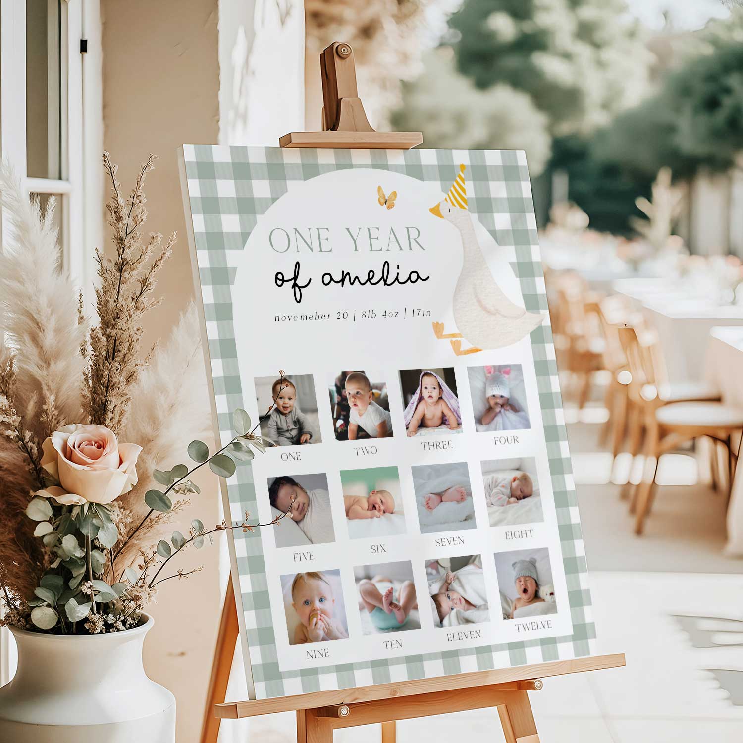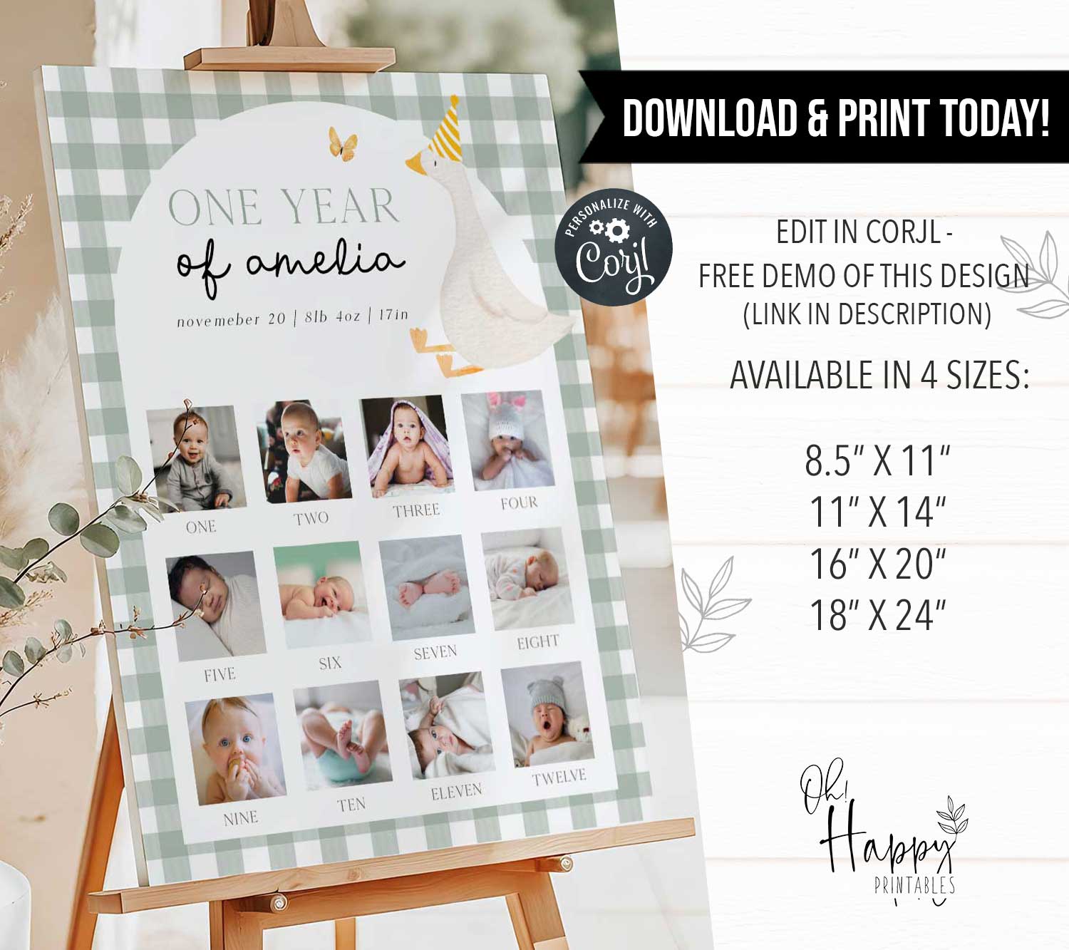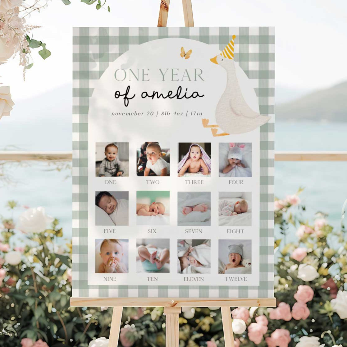 Introducing our One Silly Goose 1st Birthday Milestone Photo editable poster template in green, the ideal addition to celebrate your little ones milestone! This personalised green My First Year One Silly Goose Birthday Milestone Board captures all the unforgettable photos of your little ones first year. With a beautiful One Silly Goose-themed design, this editable template allows you to customise the all details, making it a unique keepsake.