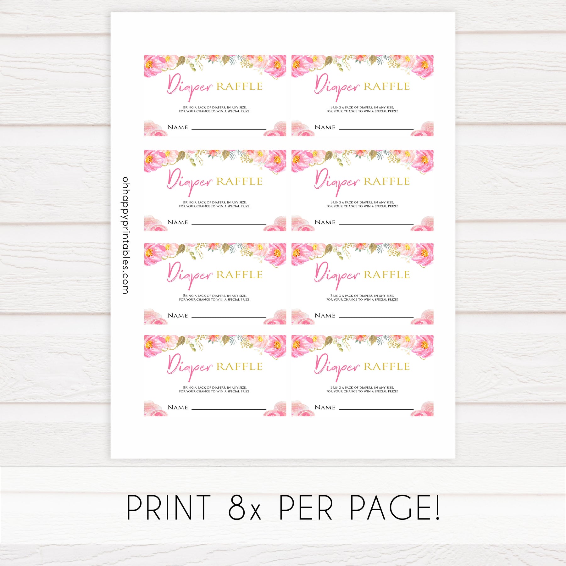Bring your diapers to win a special prize! The Diaper Raffle is a classic baby shower game that all your friends will love. Give your friends the diaper raffle ticket with their invitation. Those who bring a pack of diapers gets their ticket entered into a hat to win a prize of your choosing. Simply download these tickets and print at home.