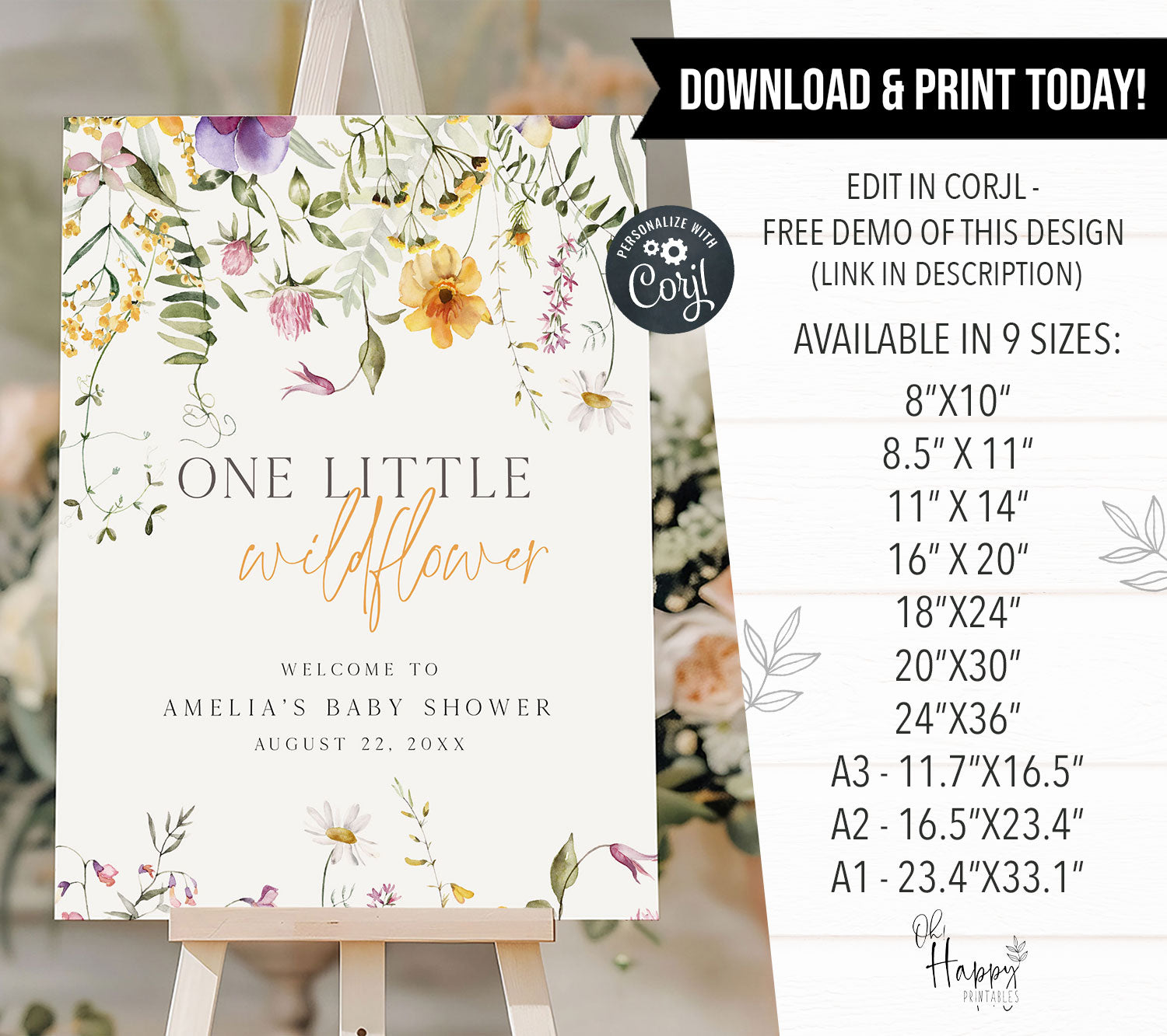 Celebrate your little one's first birthday day with our wildflower floral 'One Little Wildflower' editable birthday welcome sign. Featuring wildflower floral  illustrations, this editable sign adds a special touch to your celebration. Edit, download and print today, it couldn't be easier.