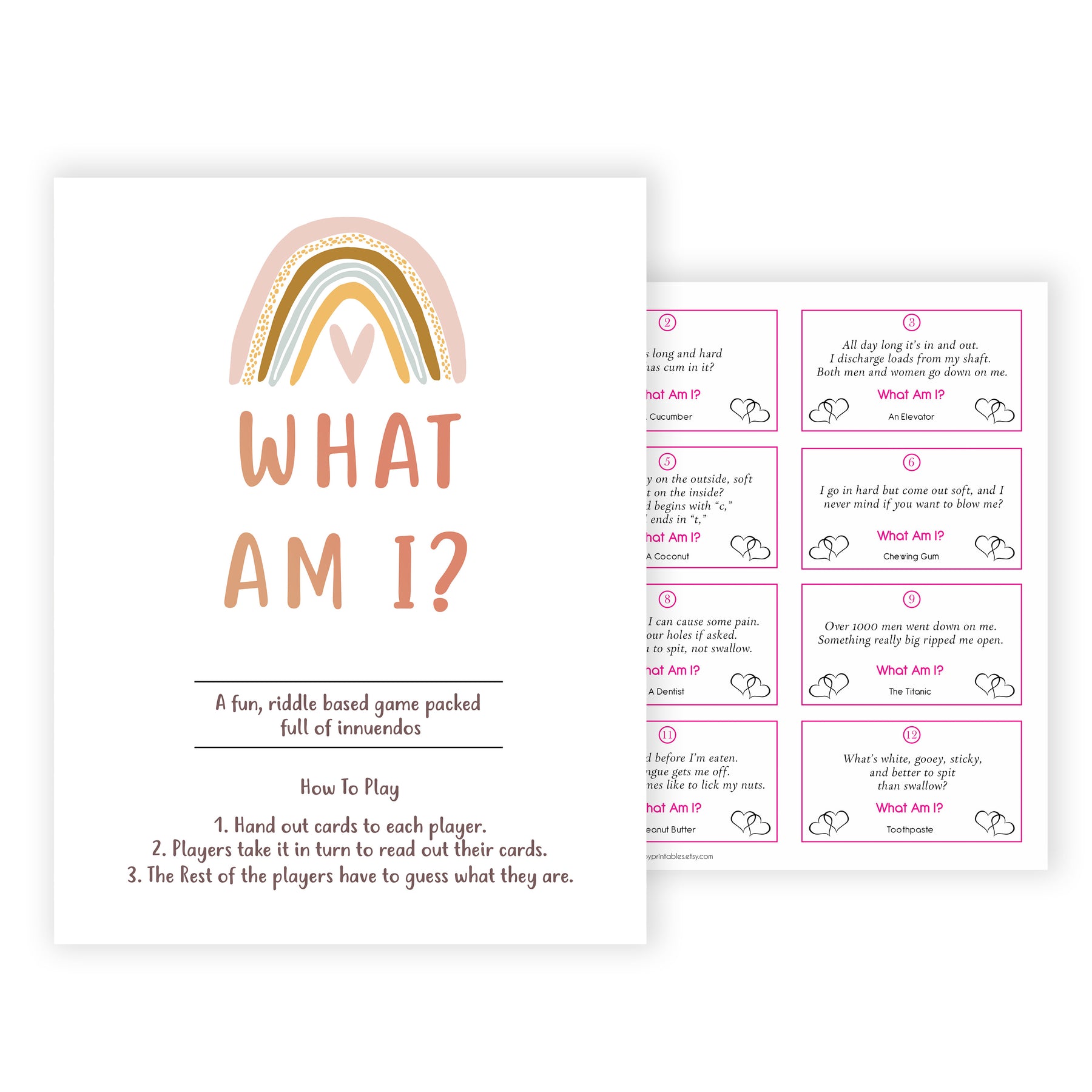 3 files to print including the 2 pages of 12 innuendo riddles, 24 in total, and 1 rules page.
