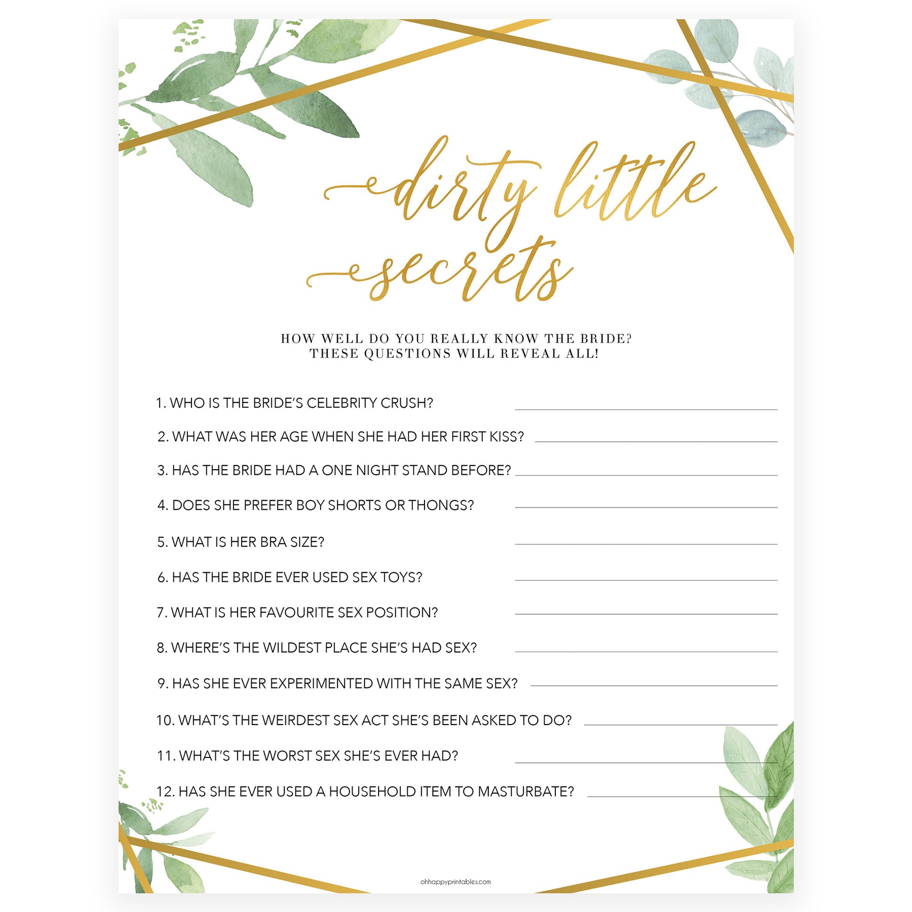 Do you really know the bride-to-be? These questions reveal a saucier side to her you might not recognise! A great game to play with your girlfriends, hearing everyone's guesses about the bride's dirty little secrets is half the fun.