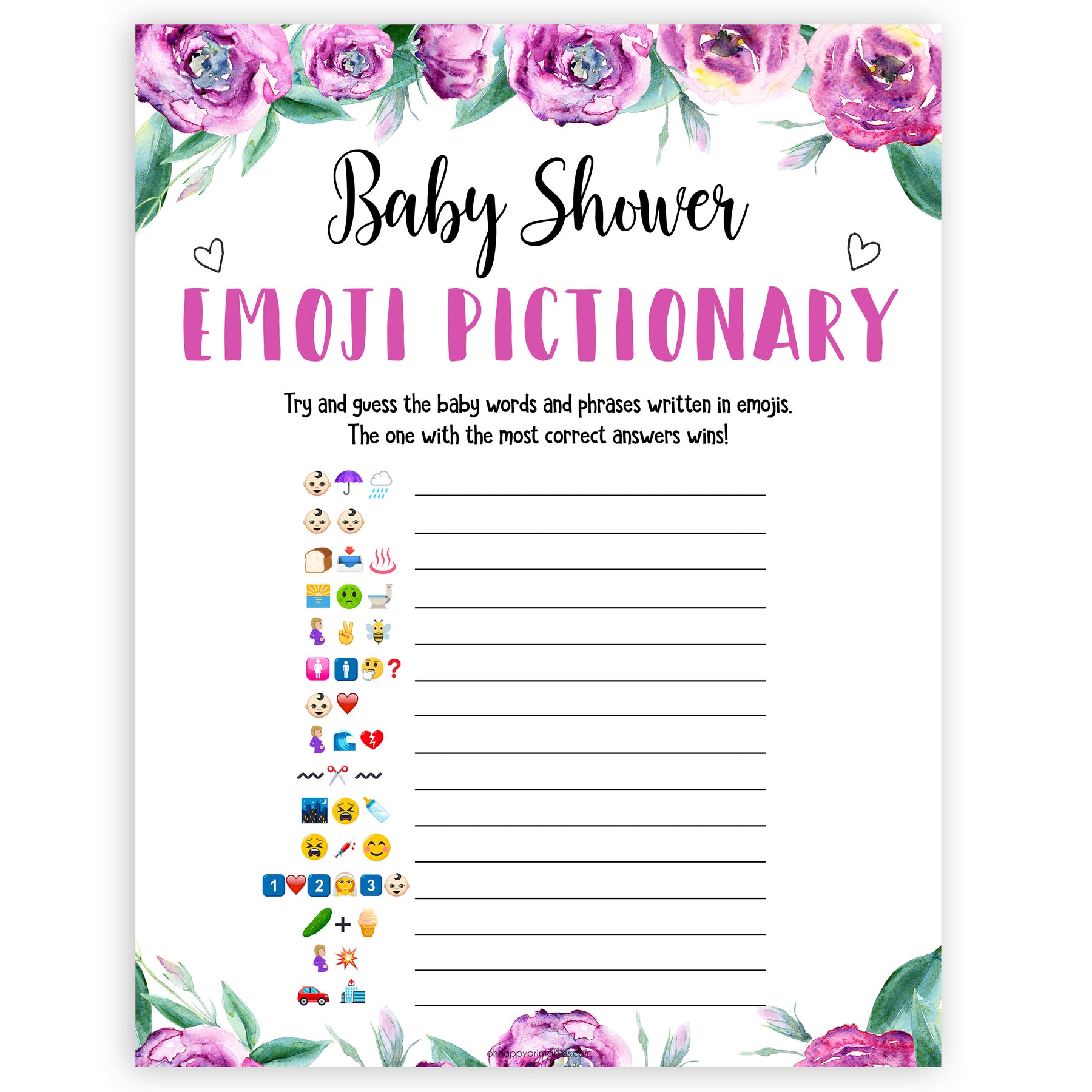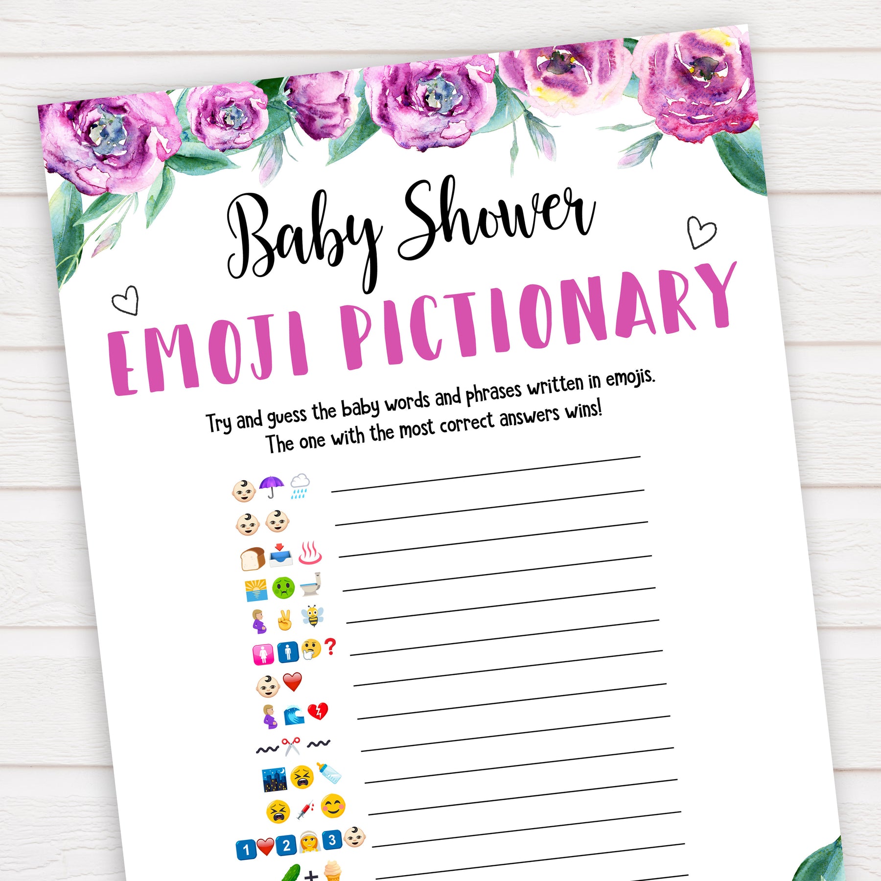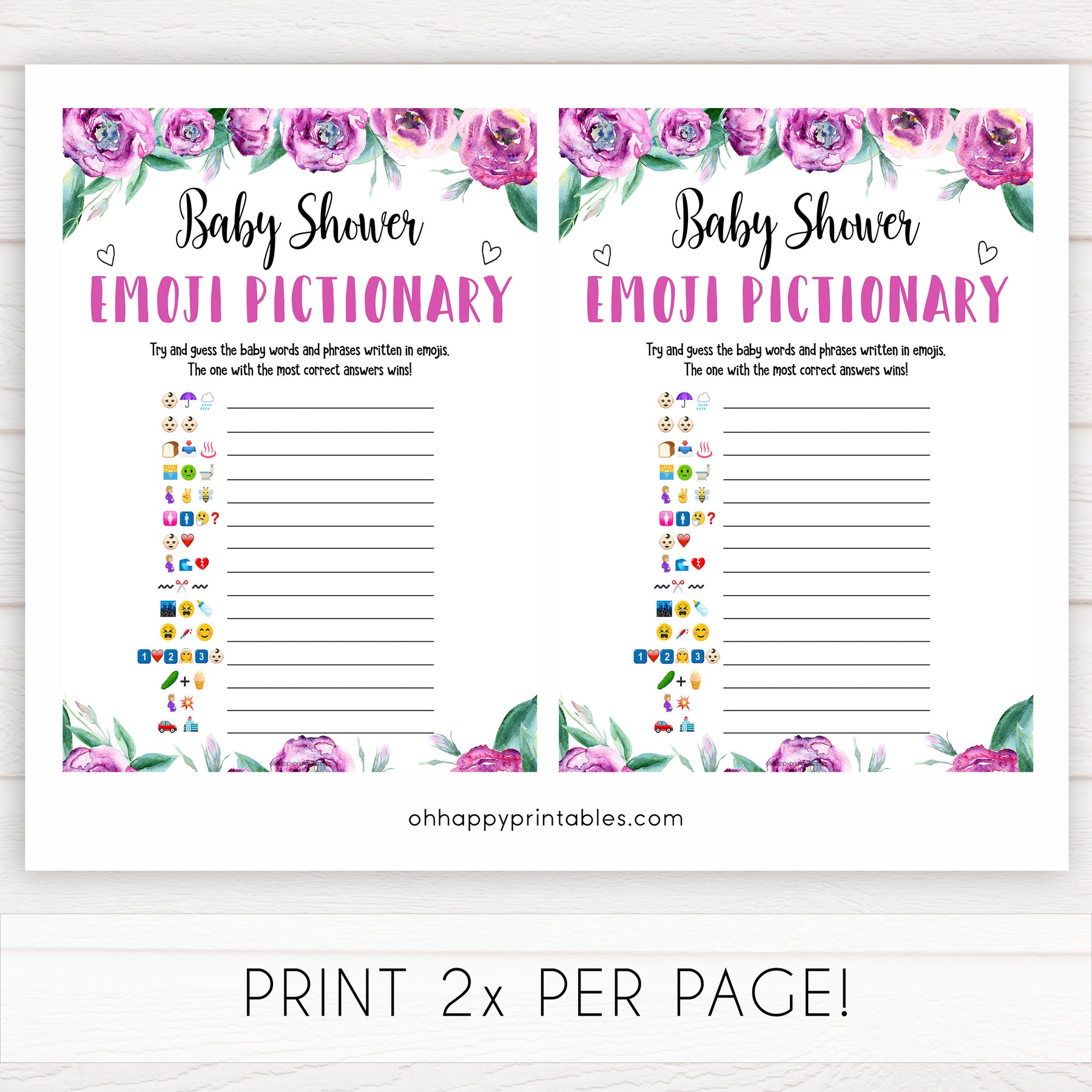 Purple peonies emoji Pictionary baby shower games, printable baby shower games, fun baby shower games, baby shower games, popular baby shower games, floral baby shower games, purple baby shower themes