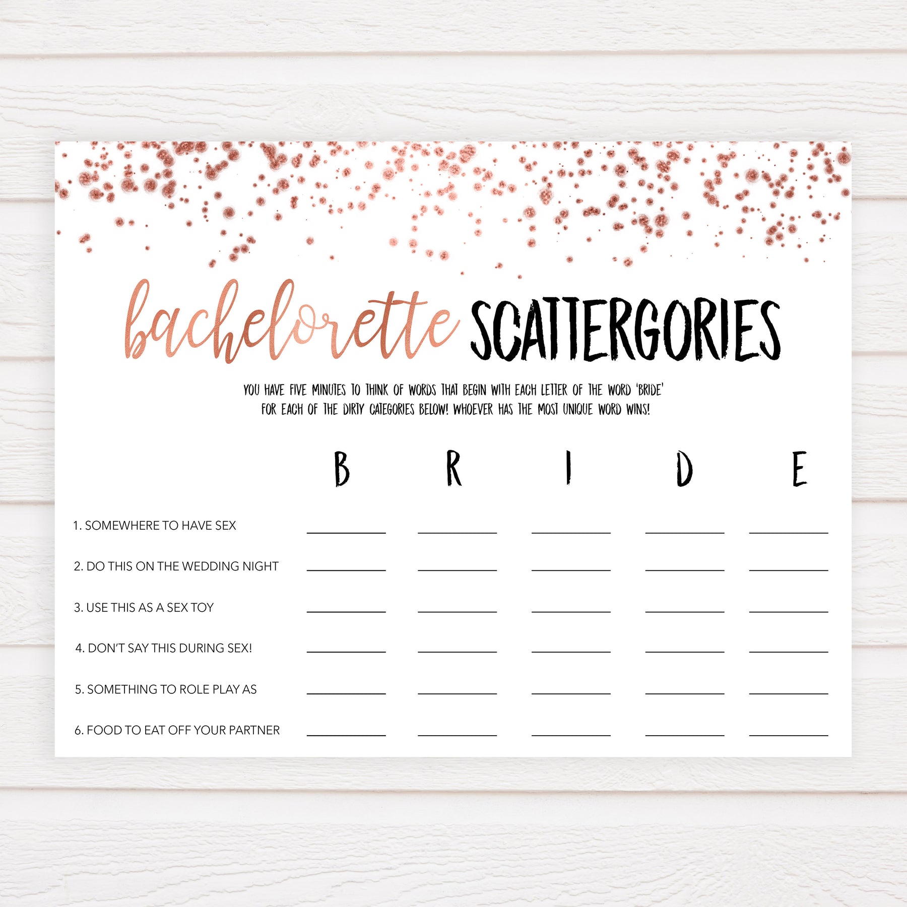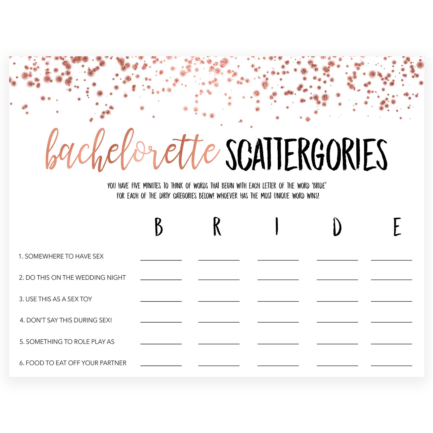 Dirty Scattergories is a naughty take on the classic game. Can you provide unique answers for the dirty categories? This is a fun bachelorette game where you can let your imagination go wild. Simply download and print at home, it couldn't be easier.