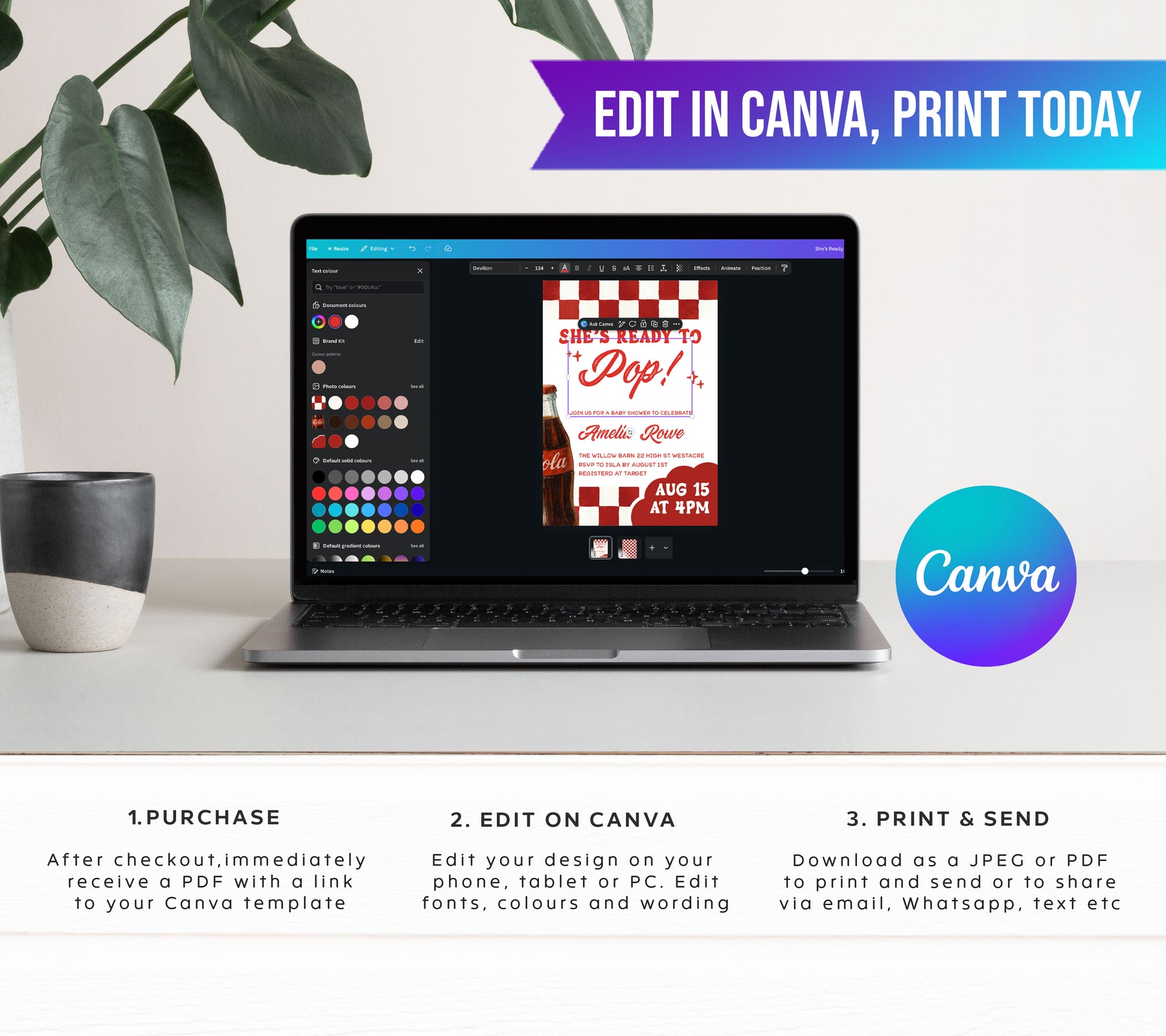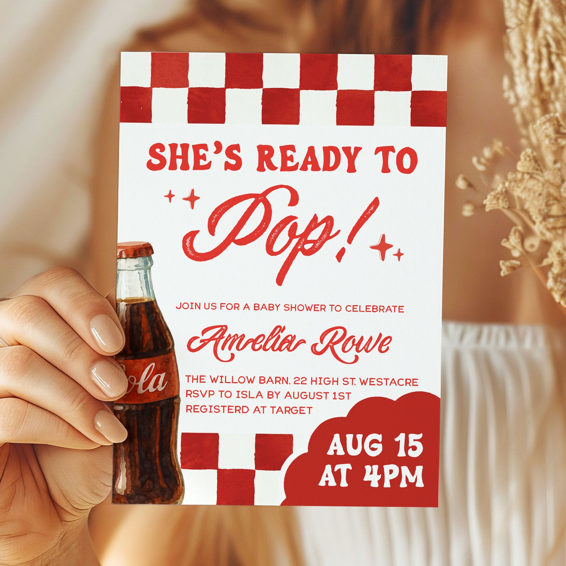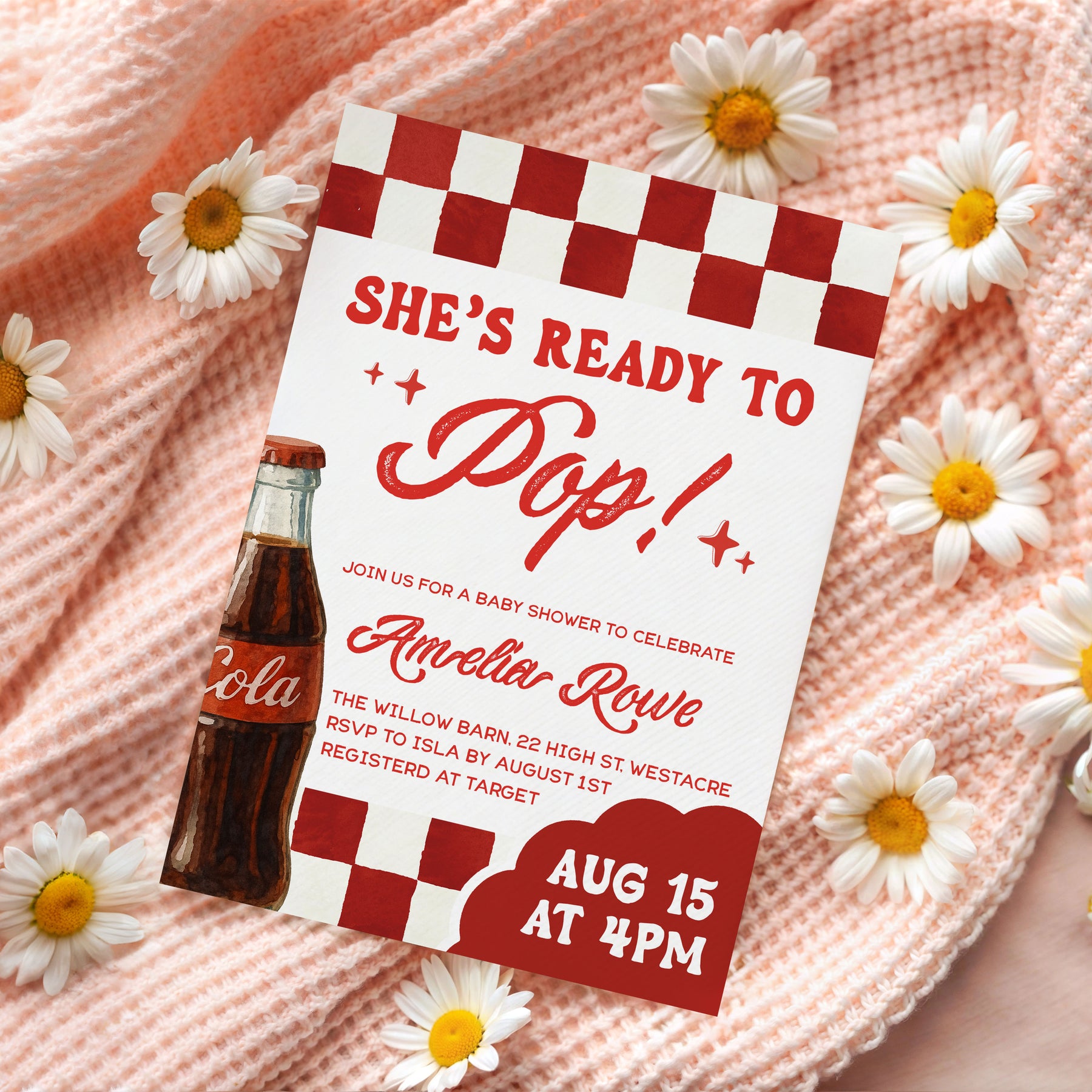 Celebrate your new arrival with our Retro style “She’s Ready to Pop!” themed baby shower invitation. Easy to edit in Canva and send or print today! It couldn't be easier.