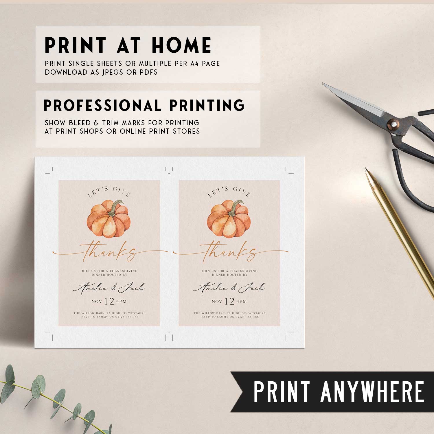 Make your Thanksgiving celebration extra special with our Editable Thanksgiving Dinner Invitation Set. Adorned with cozy autumn-themed illustrations. Customize the text to include your name, event details, and a warm holiday message. Whether you choose to print or share digitally, our versatile set offers convenience and a festive touch for any Friendsgiving or Thanksgiving gathering.
