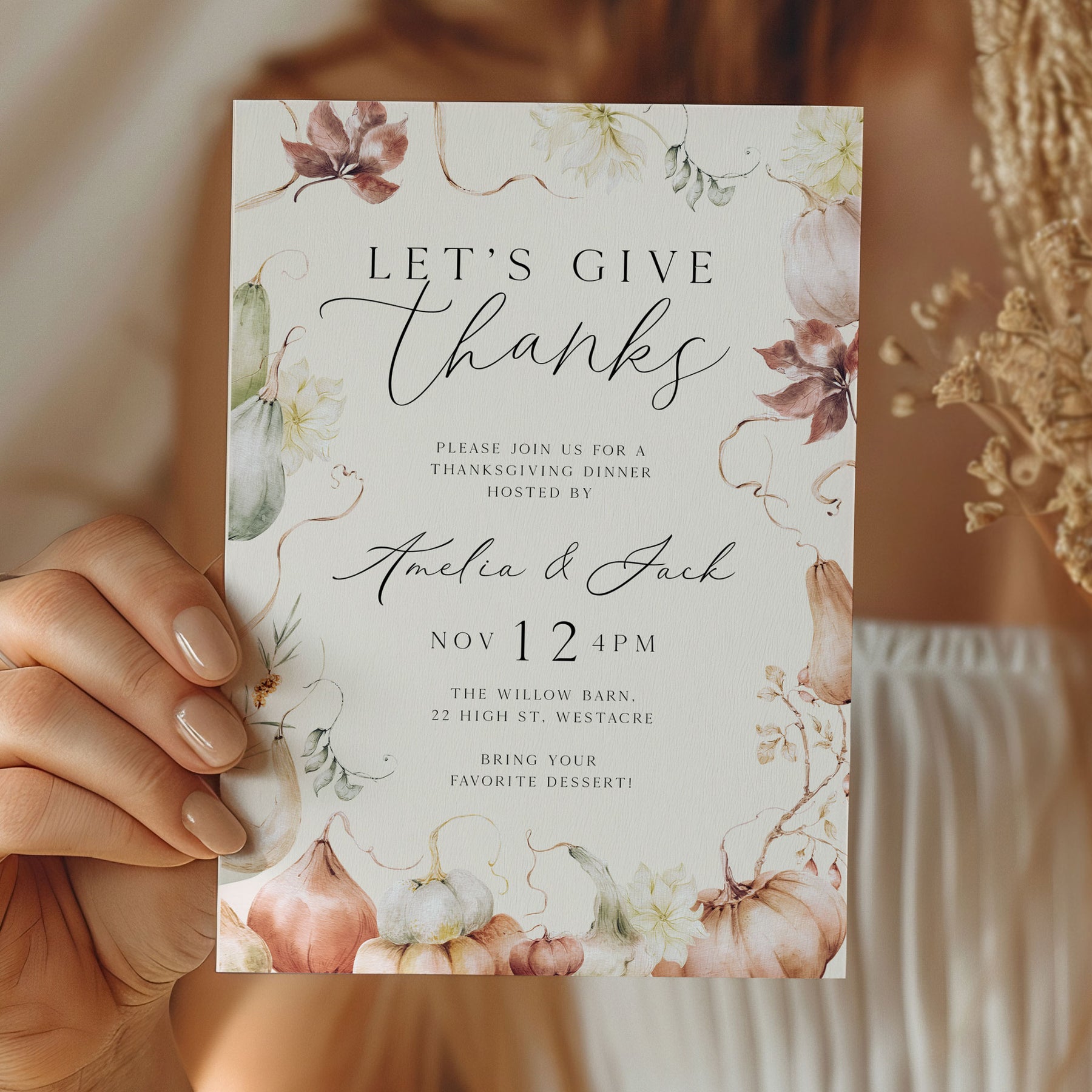Make your Thanksgiving celebration extra special with our Editable Thanksgiving Dinner Invitation Set. Adorned with cozy autumn-themed illustrations. Customize the text to include your name, event details, and a warm holiday message. Whether you choose to print or share digitally, our versatile set offers convenience and a festive touch for any Friendsgiving or Thanksgiving gathering.
