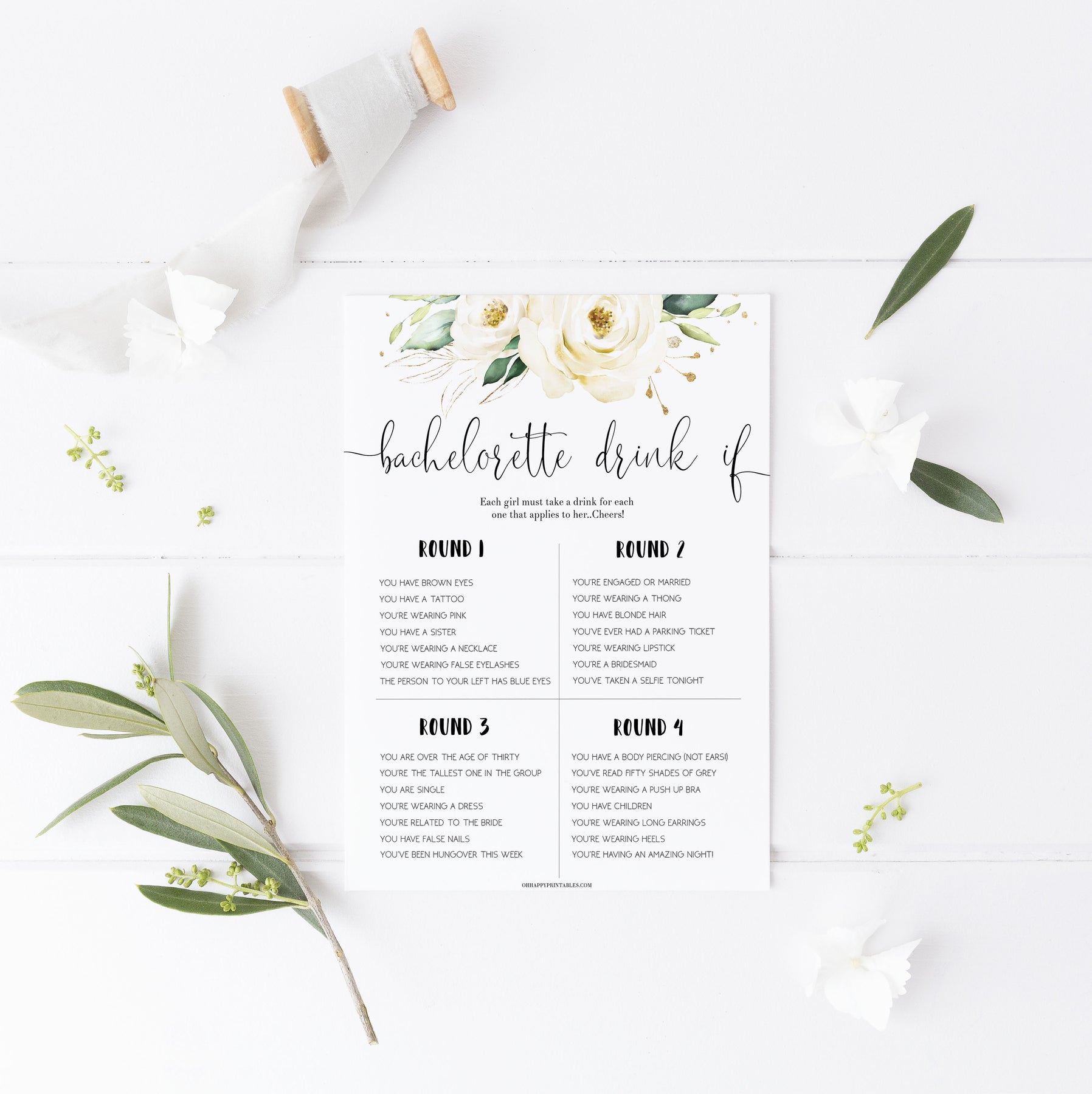 Get everyone in the mood to party with this hilarious Bachelorette Drink If game! Featuring a variety of fun scenarios, no one is getting away without drinking here!