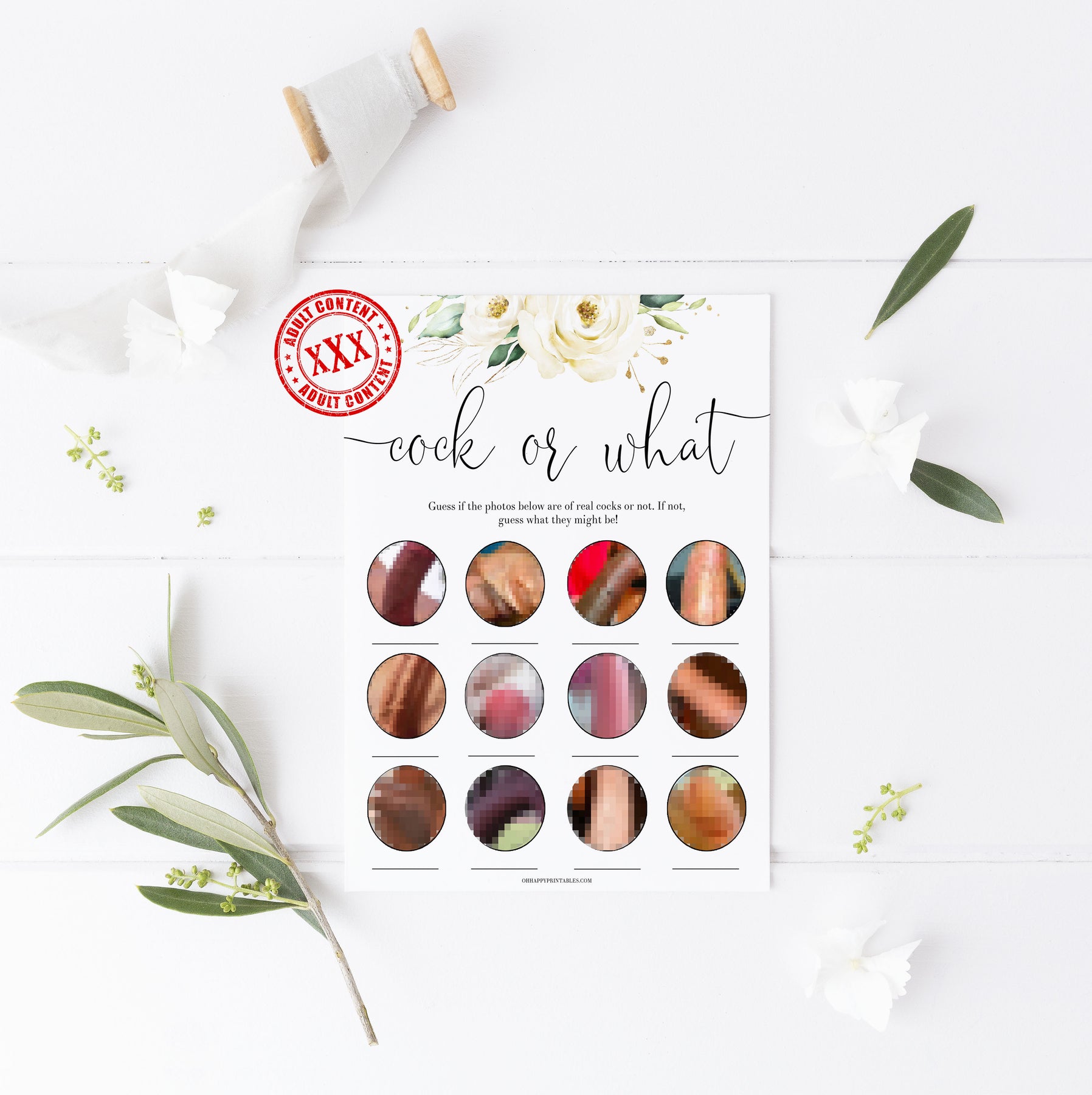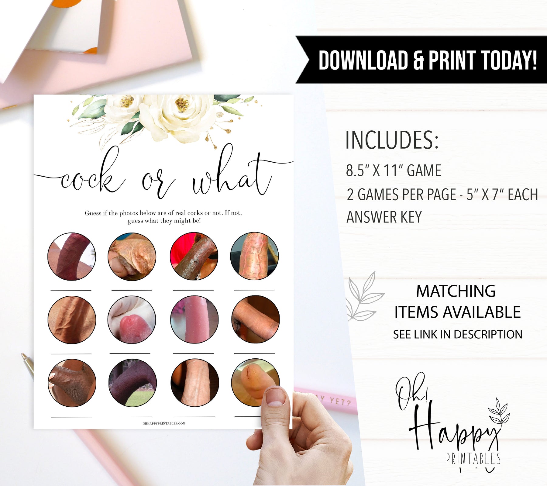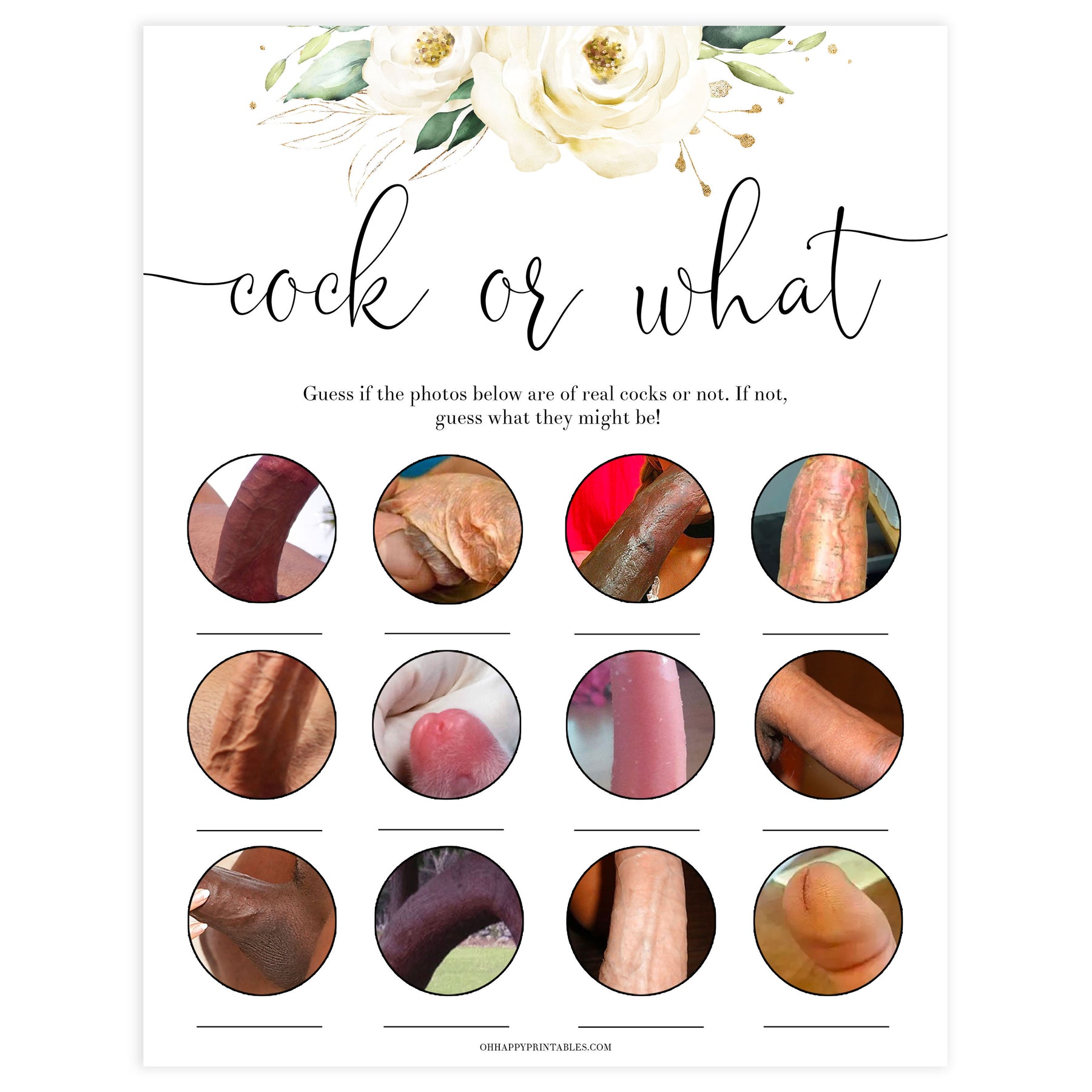 A hilarious bridal shower game that's great for brides who like to have a bit of fun! Guess whether the photo is a cock - or something a little more innocent! This printable game comes with a photo reveal answer key, and is available in two sizes.