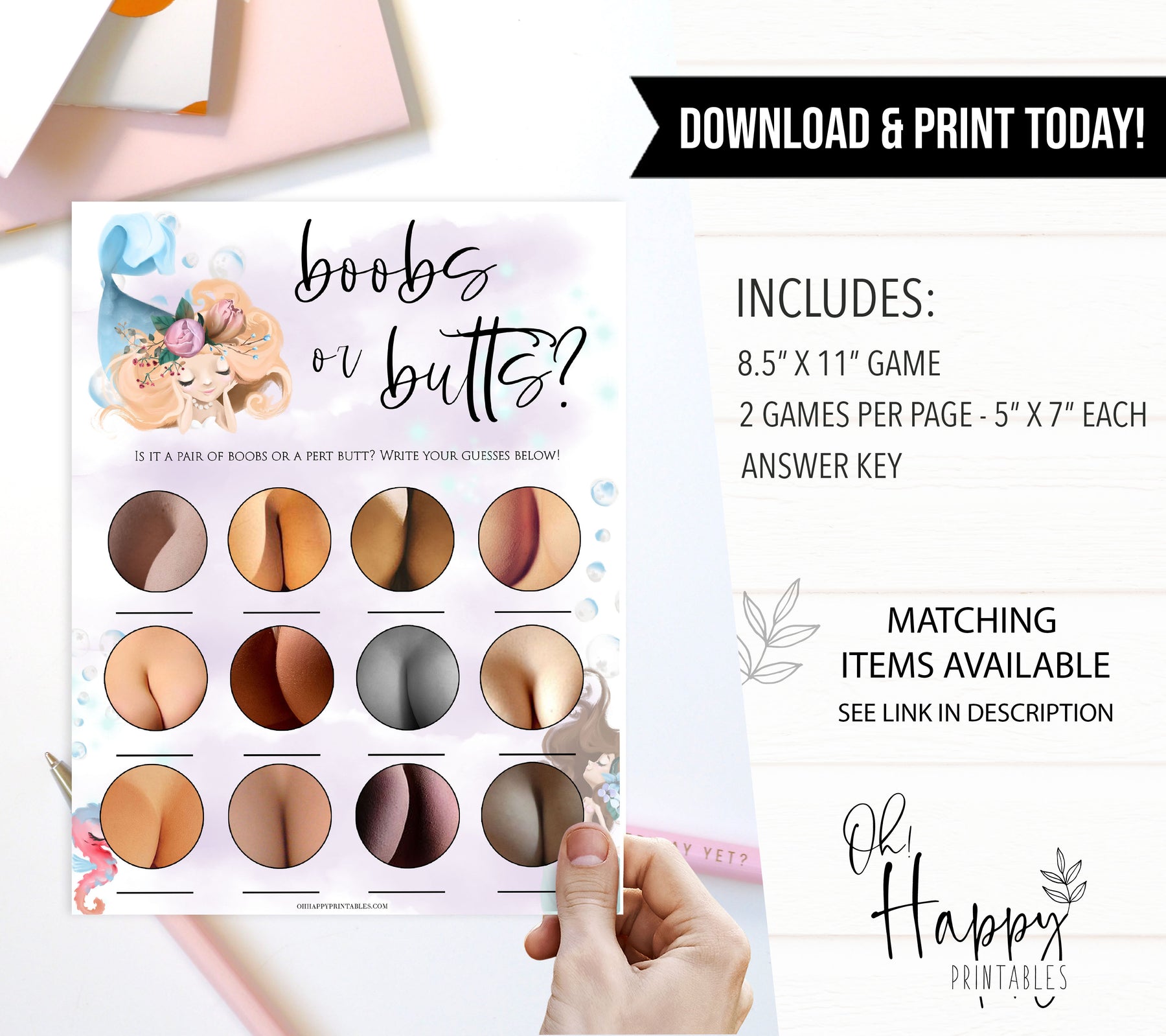 Our printable Boobs or Butts game is a hilarious baby shower game that's perfect for those who like to have a bit of fun! Guess whether the picture is a pair of womans boobs or a butt. Our printable Boobs or Butts game comes complete with answer sheet. All you need to do is download and print at home, it couldn't be easier.